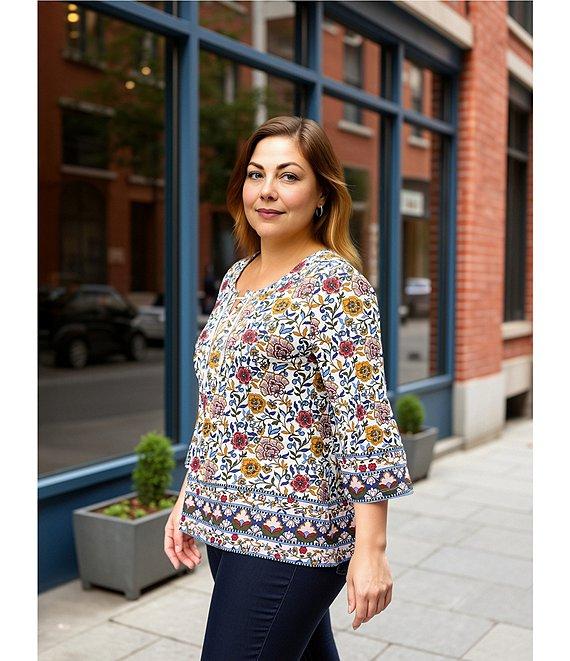 Allison Daley Plus Vintage Bloom Border Print 3/4 Ruched Sleeve Tie Neck Knit Top
