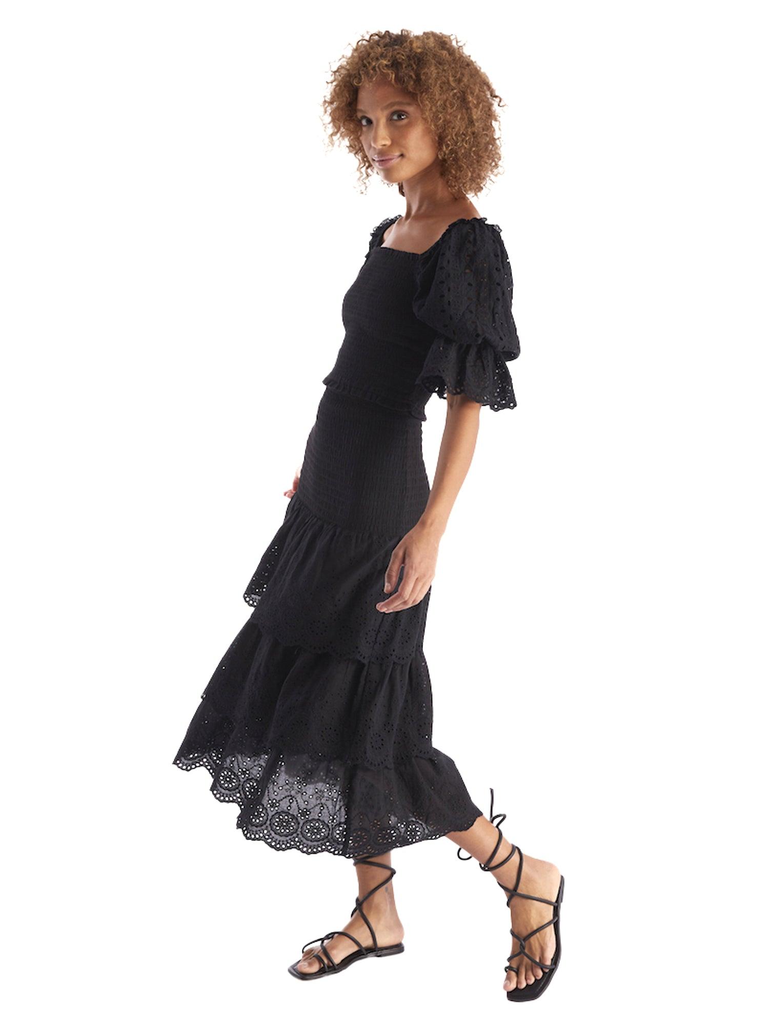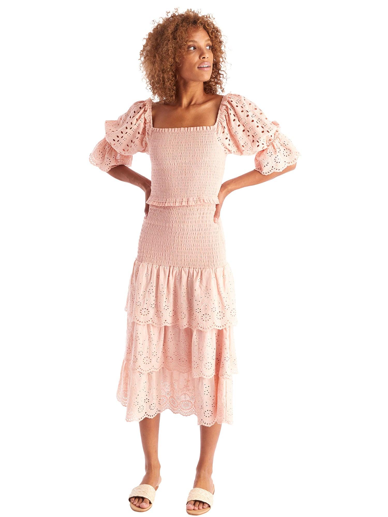 The Dani Midi Skirt features a pull on style with a smocked elastic waist. Fitted throughout the hips and ending in 3 embroidered tiers at a mid-calf length. Fully lined.