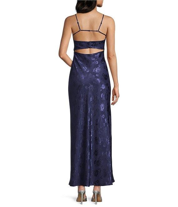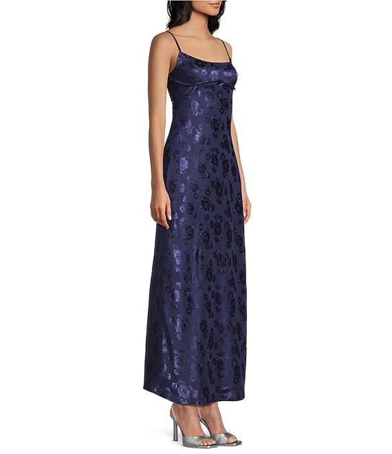From Allison & Kelly, this dress features: Satin fabrication Jacquard floral print Scoop neckline Adjustable spaghetti straps Hook back closure Back cut-out Pullover styling Midi length Approx. 56" length Polyester Machine wash/line dry Imported.