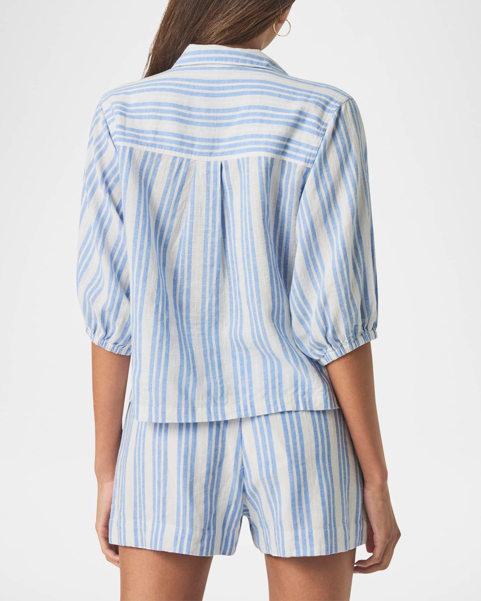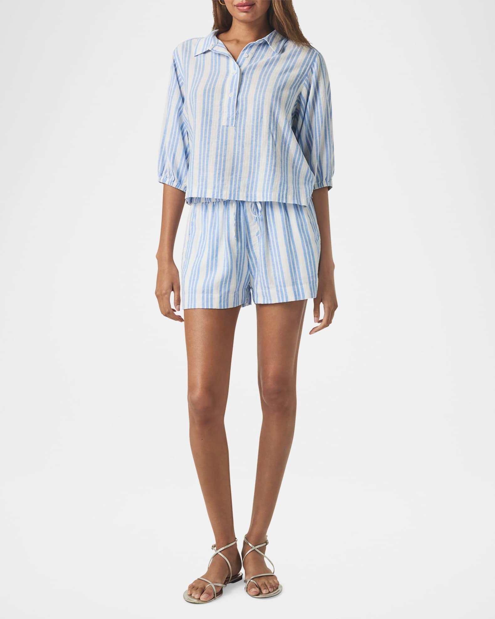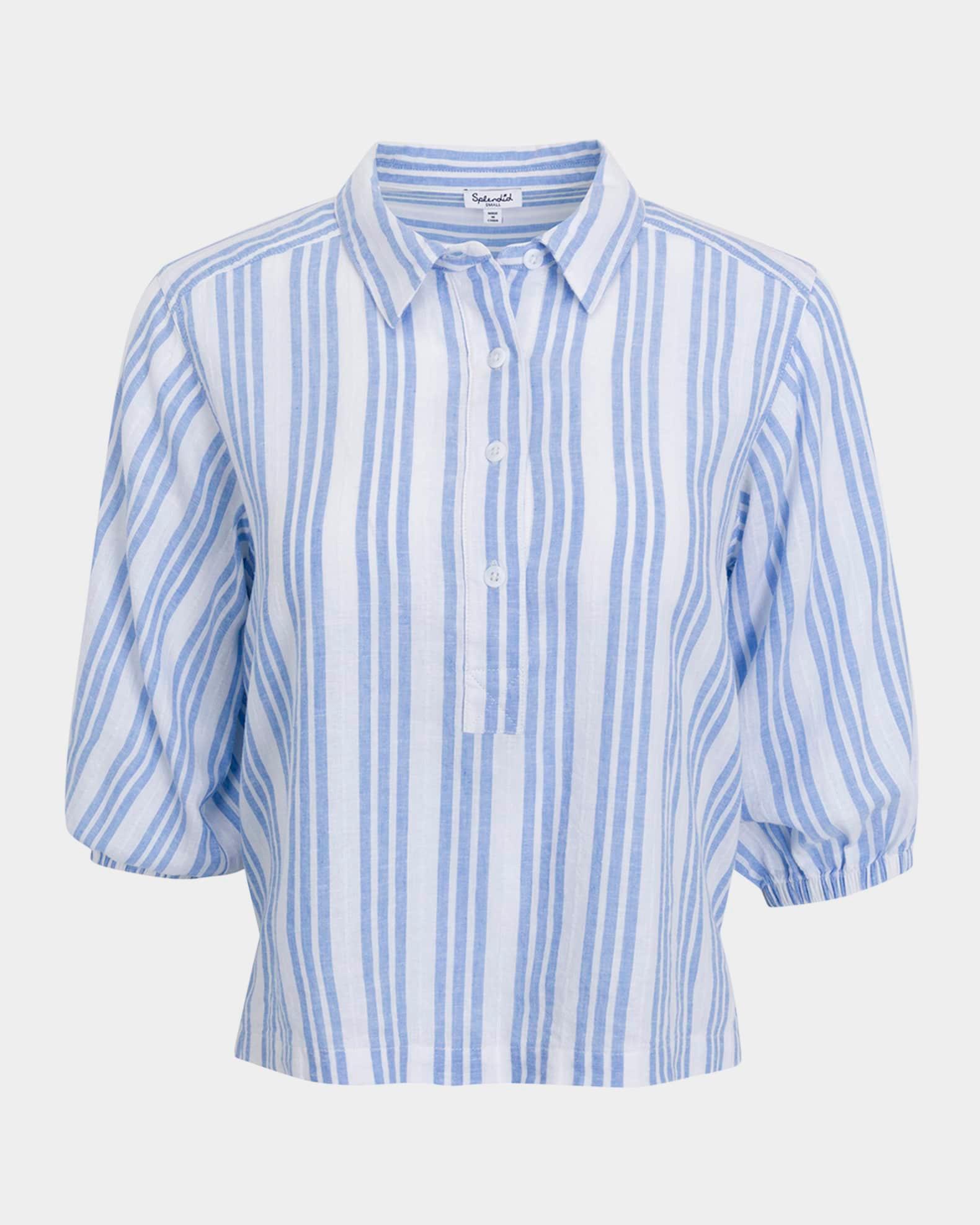 Splendid "Allison" linen-blend shirt in a classic striped design Approx. 21.3"L from shoulder to hem Spread collar; partial button front Elbow-length sleeves; elastic cuffs Yoked back Relaxed fit Hip length Pullover style Linen/viscose Imported