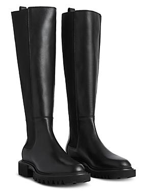 Crafted of supple leather, AllSaints Maeve boots are designed in a pull-on silhouette with stretch sides. This knee-high style is set on a chunky sole. Round toe Pulls on Leather upper Leather/textile lining EVA sole Made in Portugal SIZE Block heel: about 1.5 (35mm) ABOUT THE BRAND AllSaints was founded in East London in 1994 with the edgy perspective of the zeitgeist. Specializing in biker-inspired leather, the label has expanded to include a robust line of day-to-night ready-to-wear, outerwear and accessories that combine moody colors with delicate touches like lace and sequins. Womens Shoes - Contemporary Shoes > Allsaints > Saks Fifth Avenue > Barneys. AllSaints. Color: Black. Size: 6.