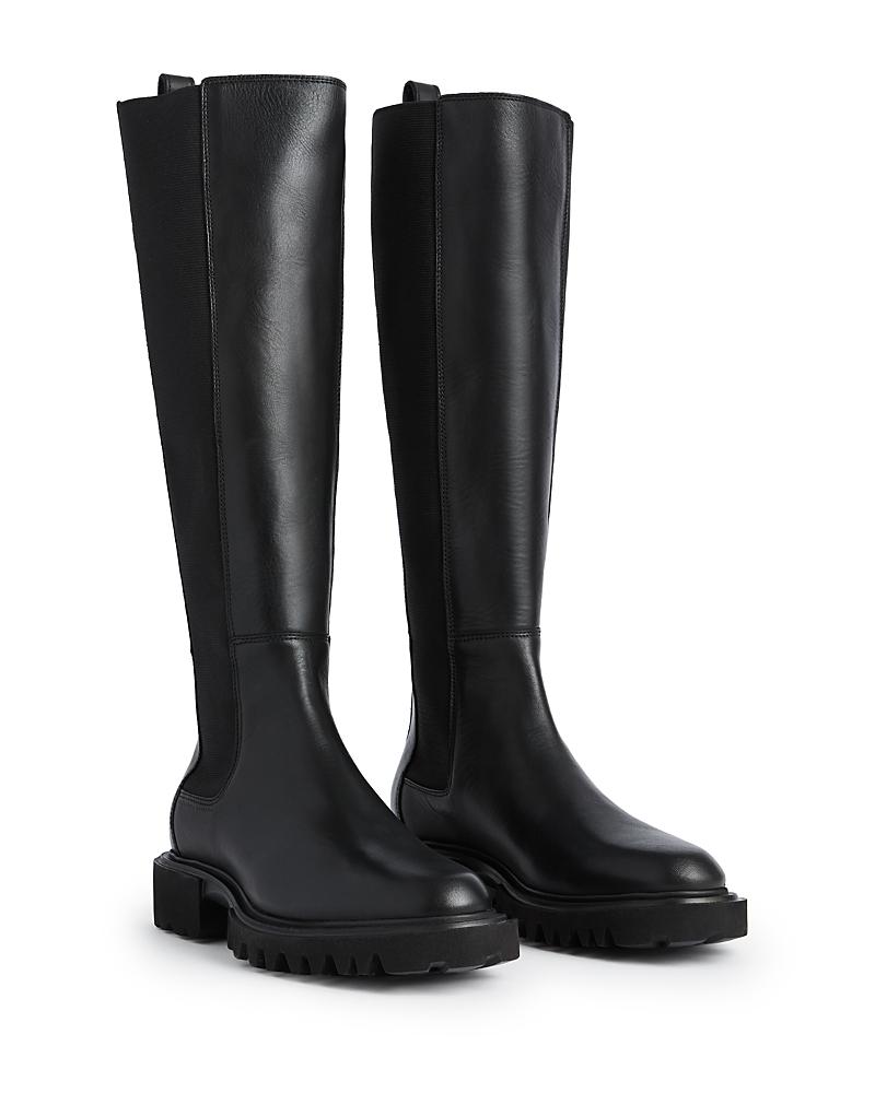 Stand tall with the glamorous allure of AllSaints Maeve Boots. Crafted from leather upper, lining and insole, the footwear features a knee length silhouette. With an elastic closure, the pair defines slip-on ease. The ethylene vinyl acetate outsole is thick and chunky, complementing the new season trend. Pull-on style. Heel pull tabs for easy wear. Stacked block heel. Round toe silhouette. Made in Portugal. Measurements: Heel Height: 1 7 16 in Circumference: 14 1 6 in Product measurements were taken using size 7, width M. Please note that measurements may vary by size.