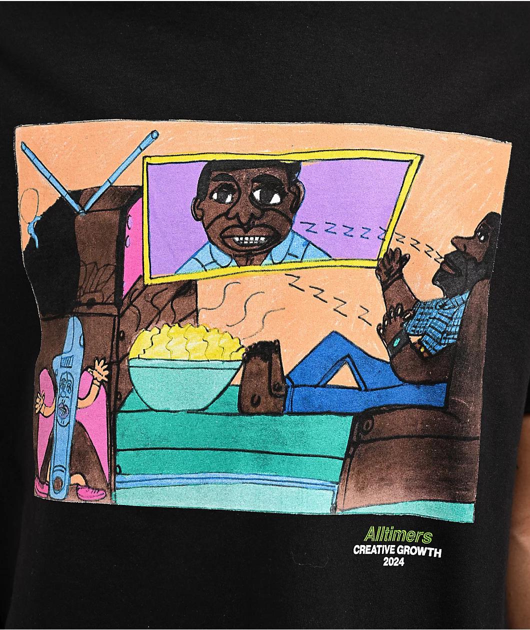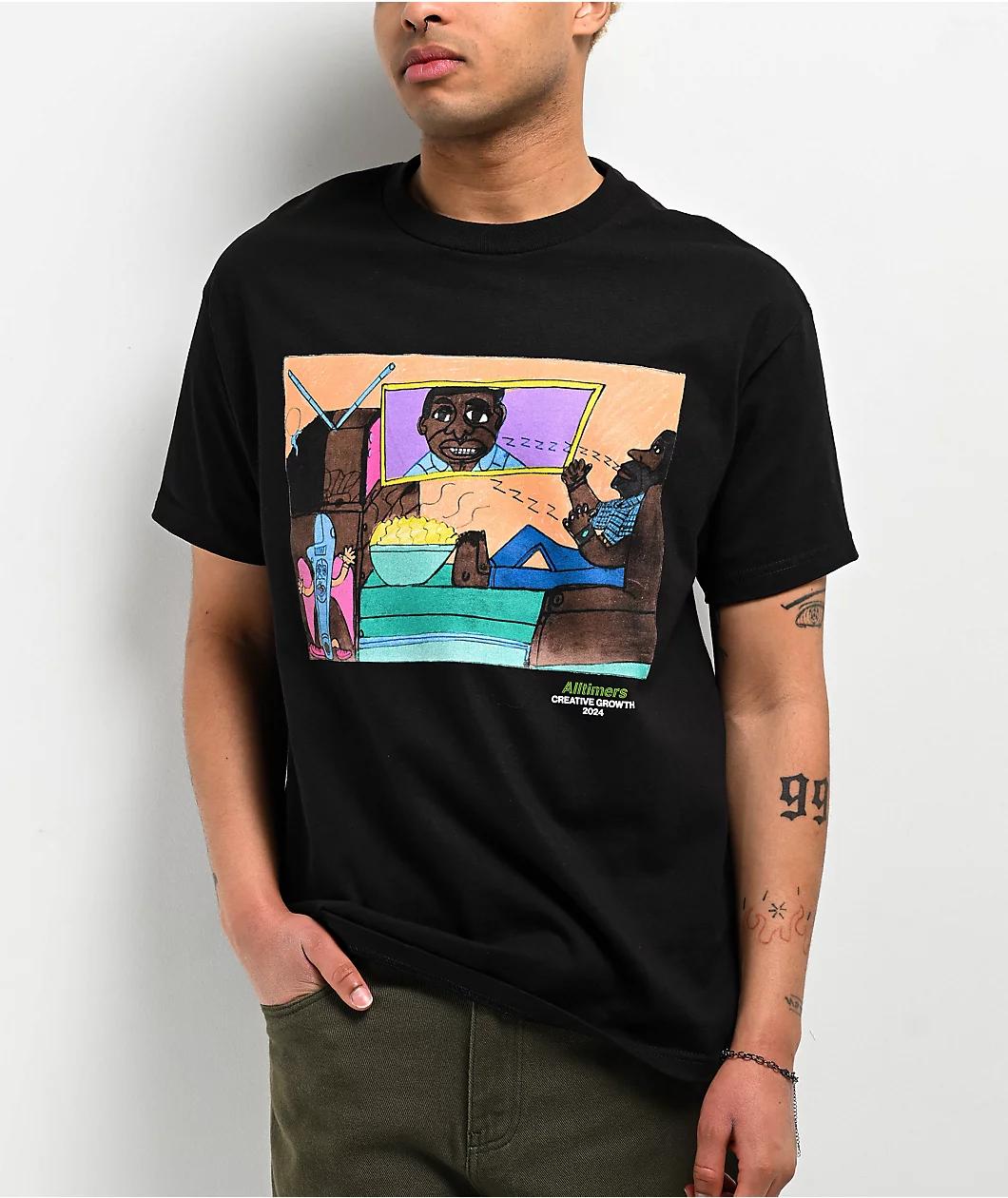 Alltimers partners with Creative Growth to introduce the John Martin t-shirt in a sleek black colorway. This collaboration is in honor of Creative Growth's fiftieth anniversary and aims to raise awareness of its mission to promote inclusive represent