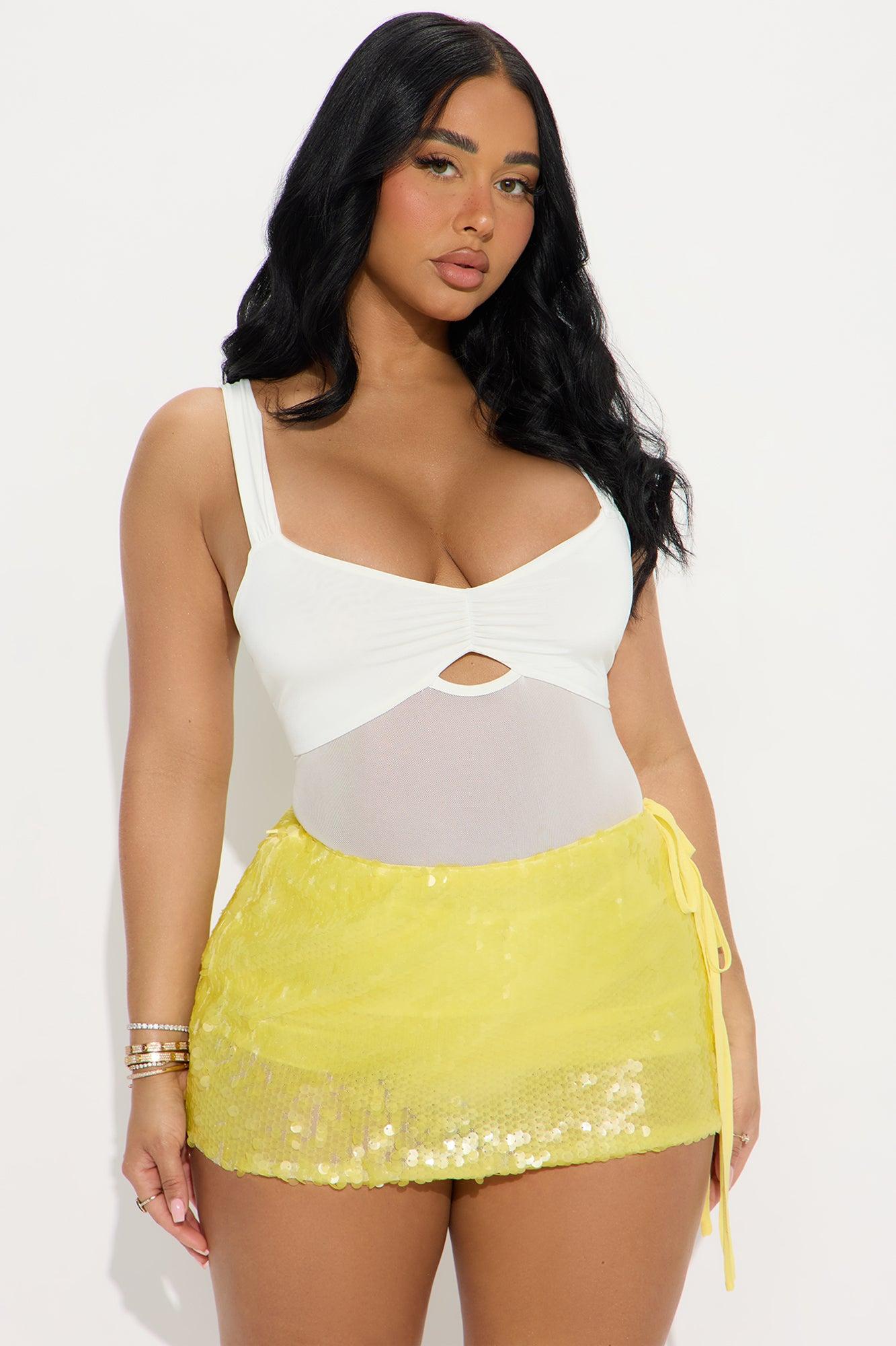 Available In Black And White. Ruched Bodysuit Stretch Sleeveless Keyhole Mesh Cut Out Seaming Thong Bottom Snap Closure Final Sale Self & Contrast: 95% Polyester 5% Spandex Imported California Proposition 65 WARNING: Cancer and Reproductive Harm - www.P65Warnings.ca.gov.