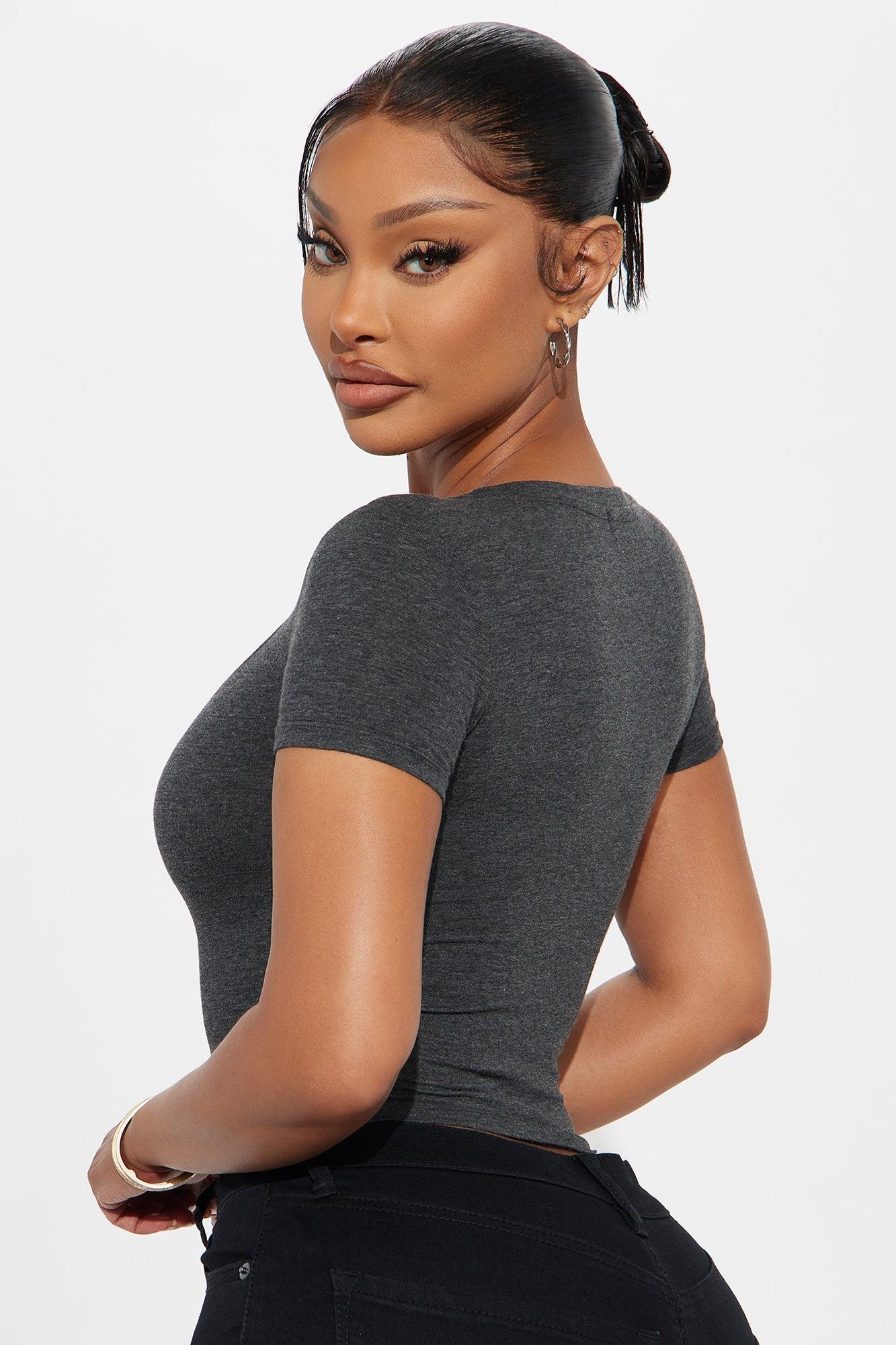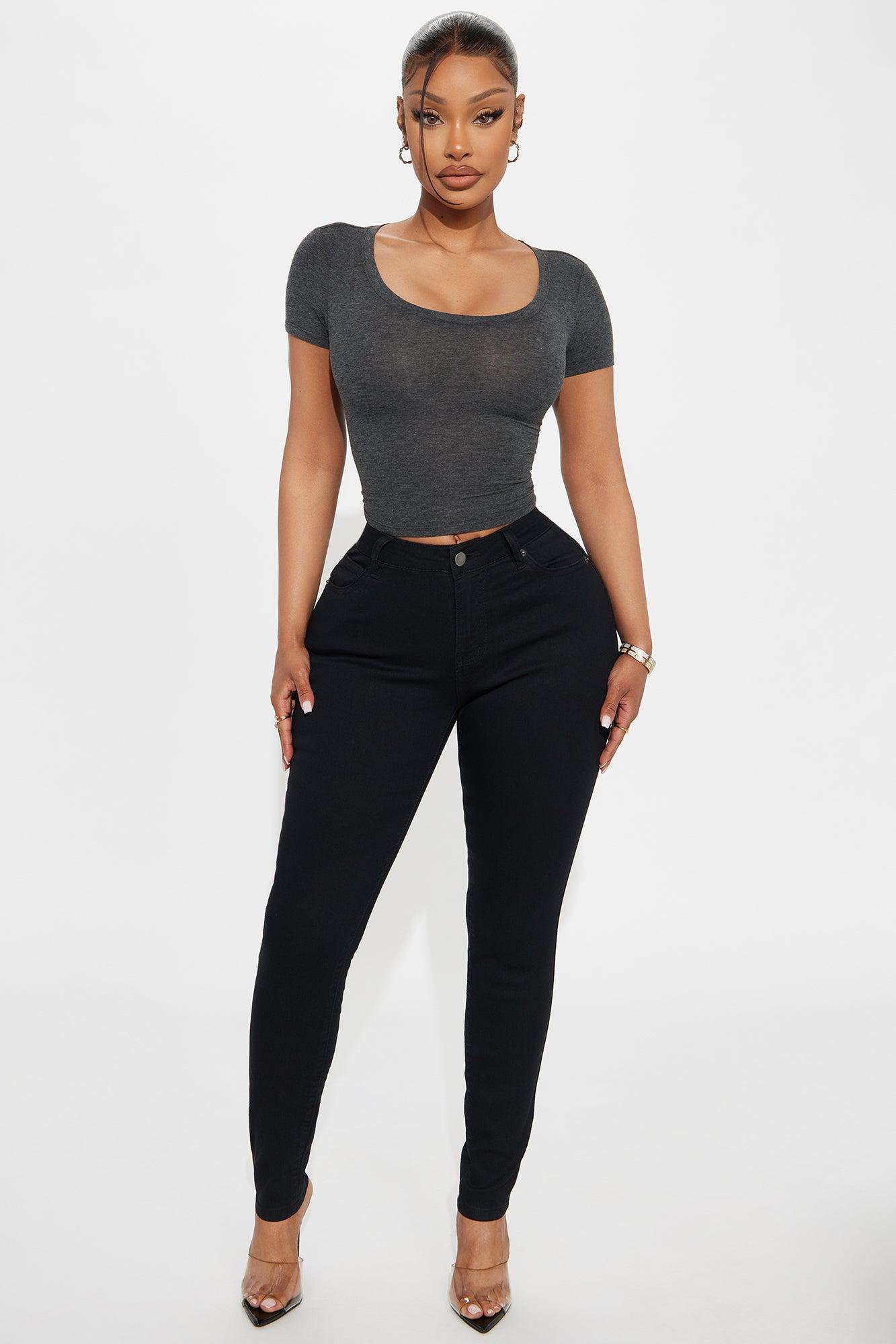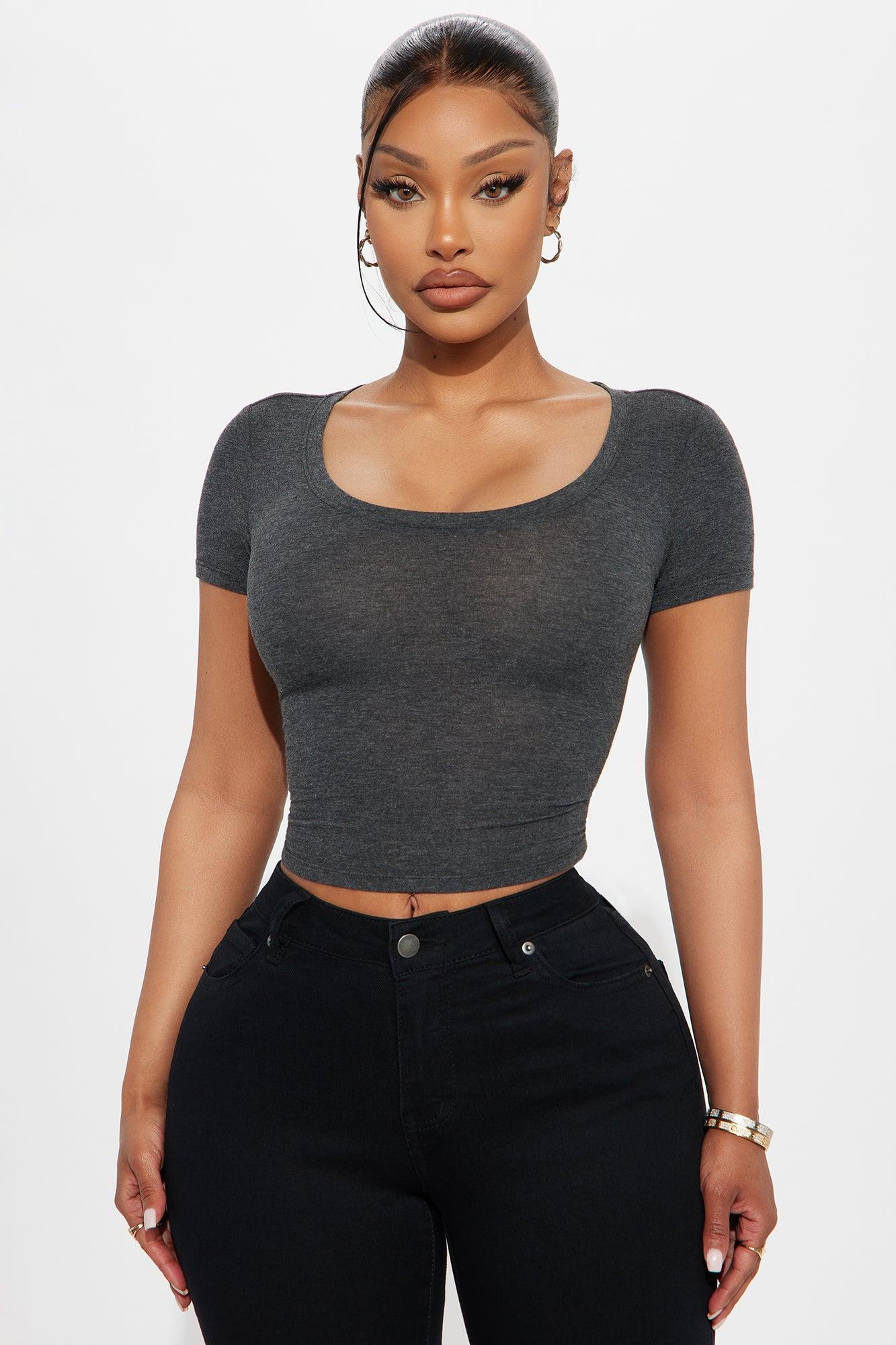Available In Charcoal, Indigo, Burgundy, And Yellow T-Shirt Scoop Neck Short Sleeve Cotton Blend Cropped Stretch 60% Cotton 35% Rayon 5% Spandex Imported