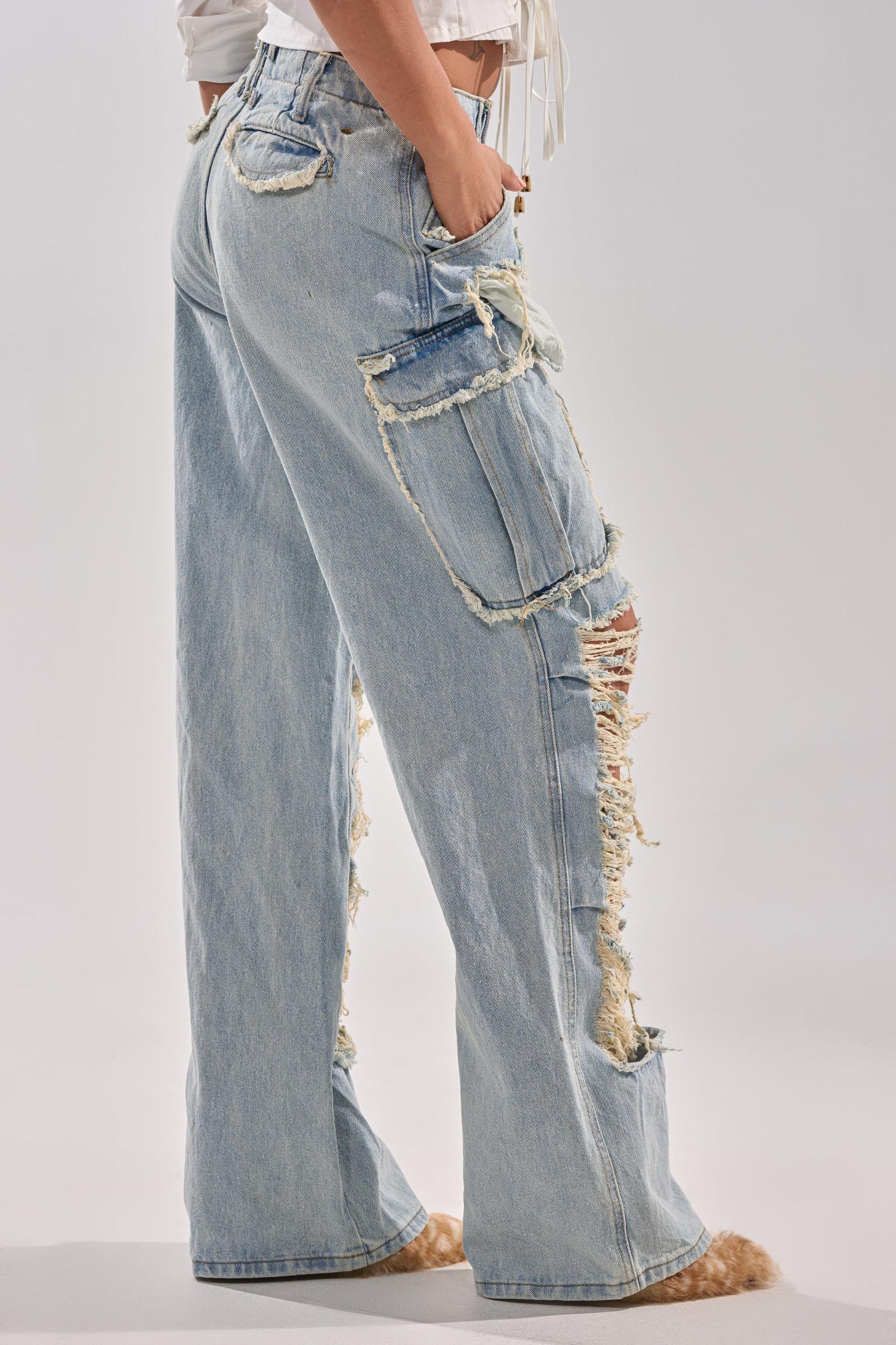 Distressed, light-wash, cargo, high-waisted jeans. These edgy pants feature two deep front pockets, distressed hem flap cargo pockets on the front and rear, distressed rips along the pockets and legs, functional belt loops, and a front button and zipper enclosure. With its light wash and stiff, structured material, these streetwear pants style perfectly with a baby tee and chunky sneakers for any casual occasion! - 100% Cotton- No Stretch- Imported (all measurements are approximate from size small)- 11” Rise- 32.5” Inseam- Model is 5’7” and wearing size smallProduct ID: 1077843 (all measurements are approximate from size 1X)- 13” Rise- 32.5” InseamProduct ID: 1077847
