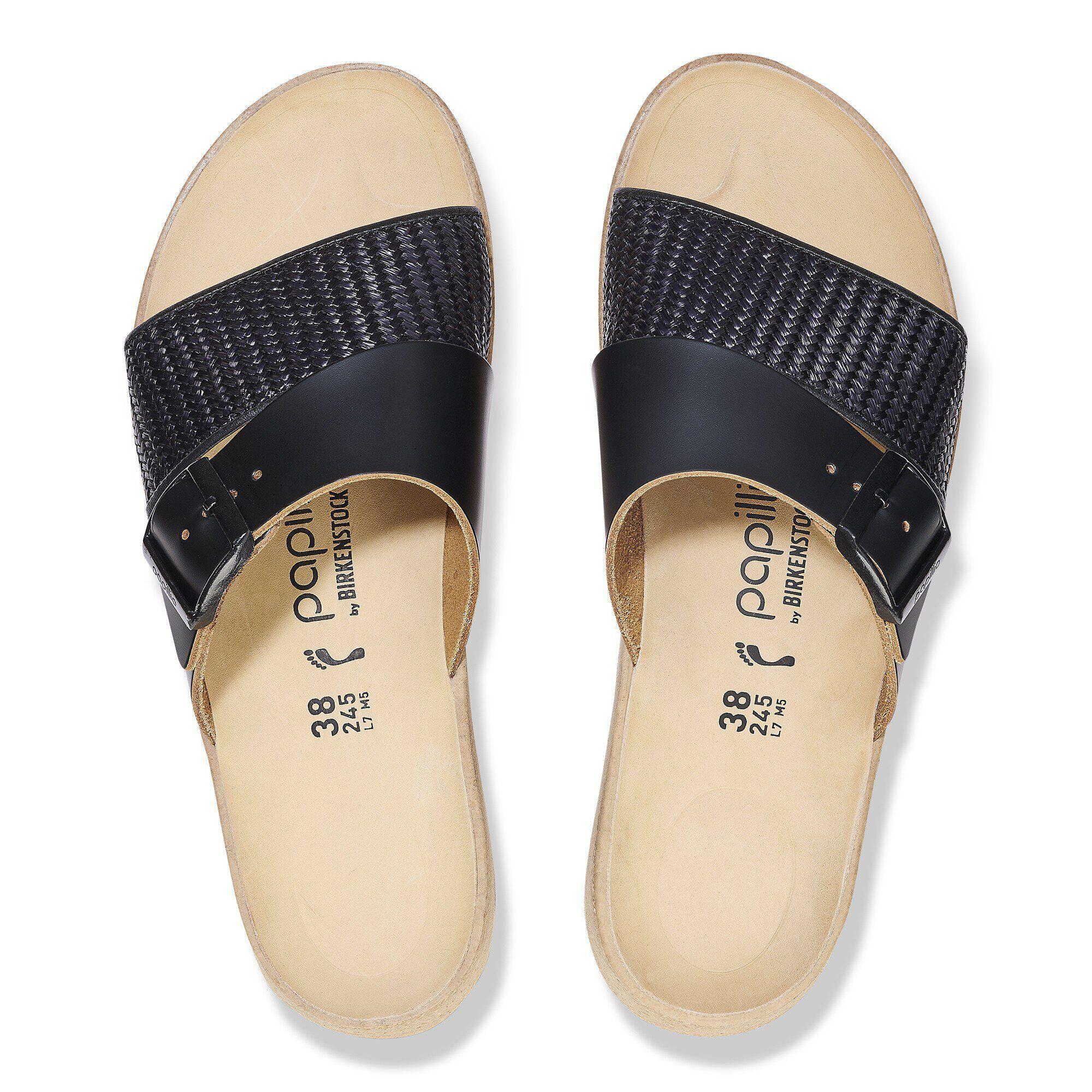 A new wedge from Papillio by BIRKENSTOCK®. The Almina's wide leather straps provide added stability while giving summer-ready raffia the space to stand out. As elevated as it looks, with a contoured footbed for the ultimate in support. Put your comfort above the rest.