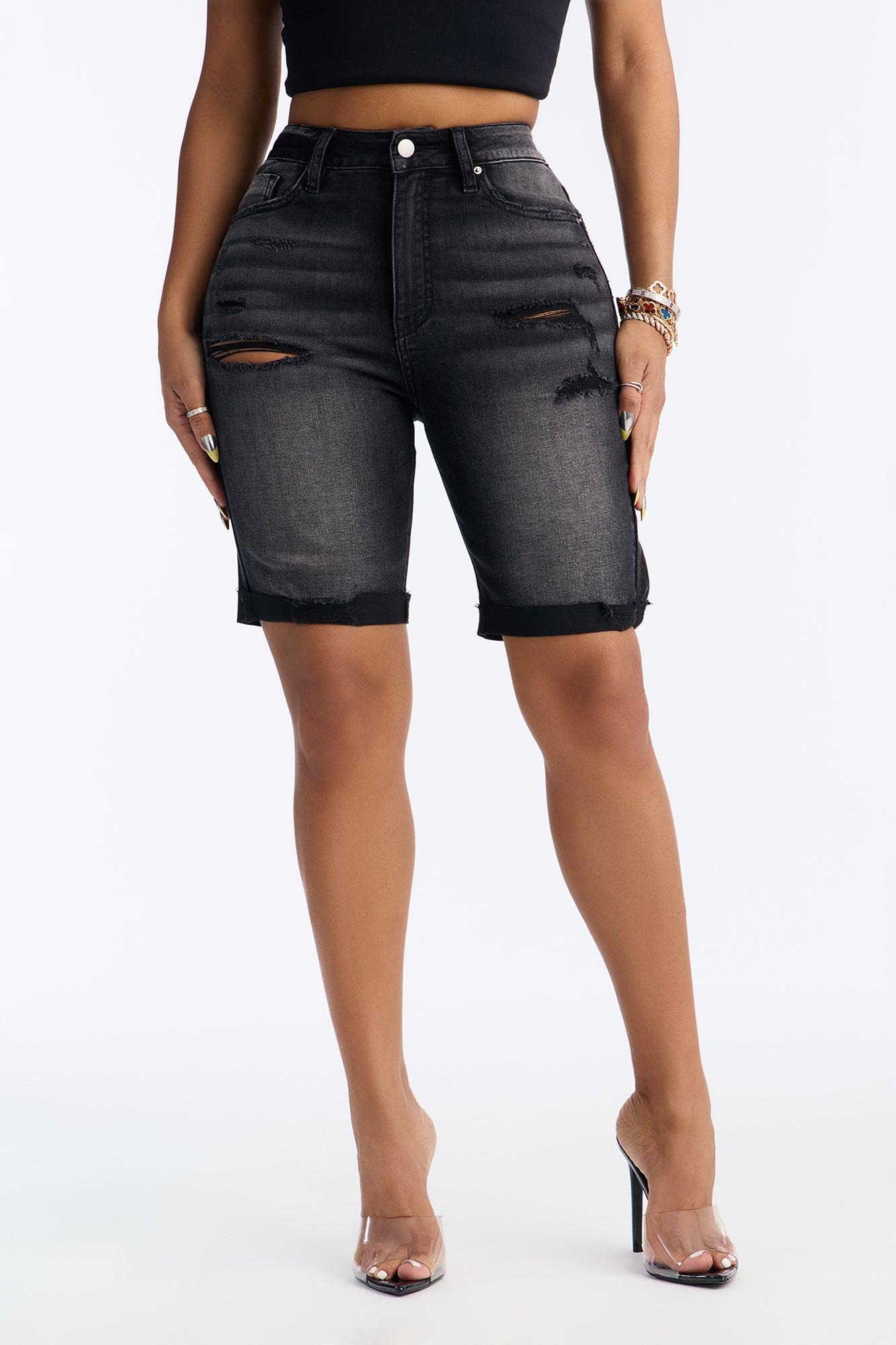 Available In Black Wash And Dark Wash. Denim Bermuda Short 5 Pocket Ripped Untacked Cuff 12" Rise 8" Inseam Rolled 9" Inseam Unrolled Medium Stretch Disclaimer: Due To The Distressing Process, Each Garment Is Unique. 70% Cotton 28% Polyester 2% Spandex Imported