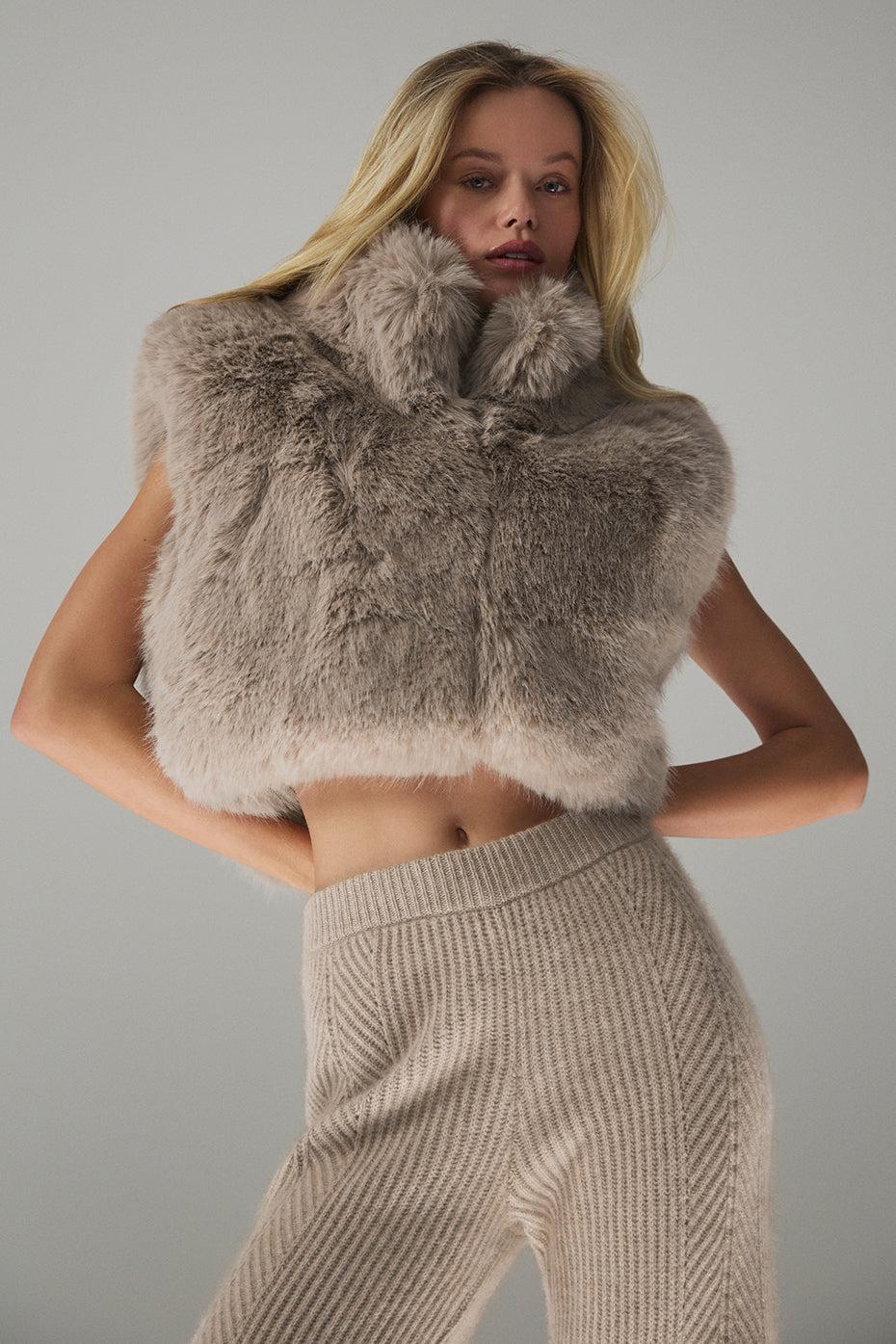 Yes—this faux fur vest is really as abundantly soft and fluffy as it looks on your screen. The boxy, cropped hem emphasizes the natural waist, and a stand collar and extended shoulders balance the look. Secure it with the hidden hook-and-eye closures, or wear it open to show off the slinky slip dress you’ll wear underneath.