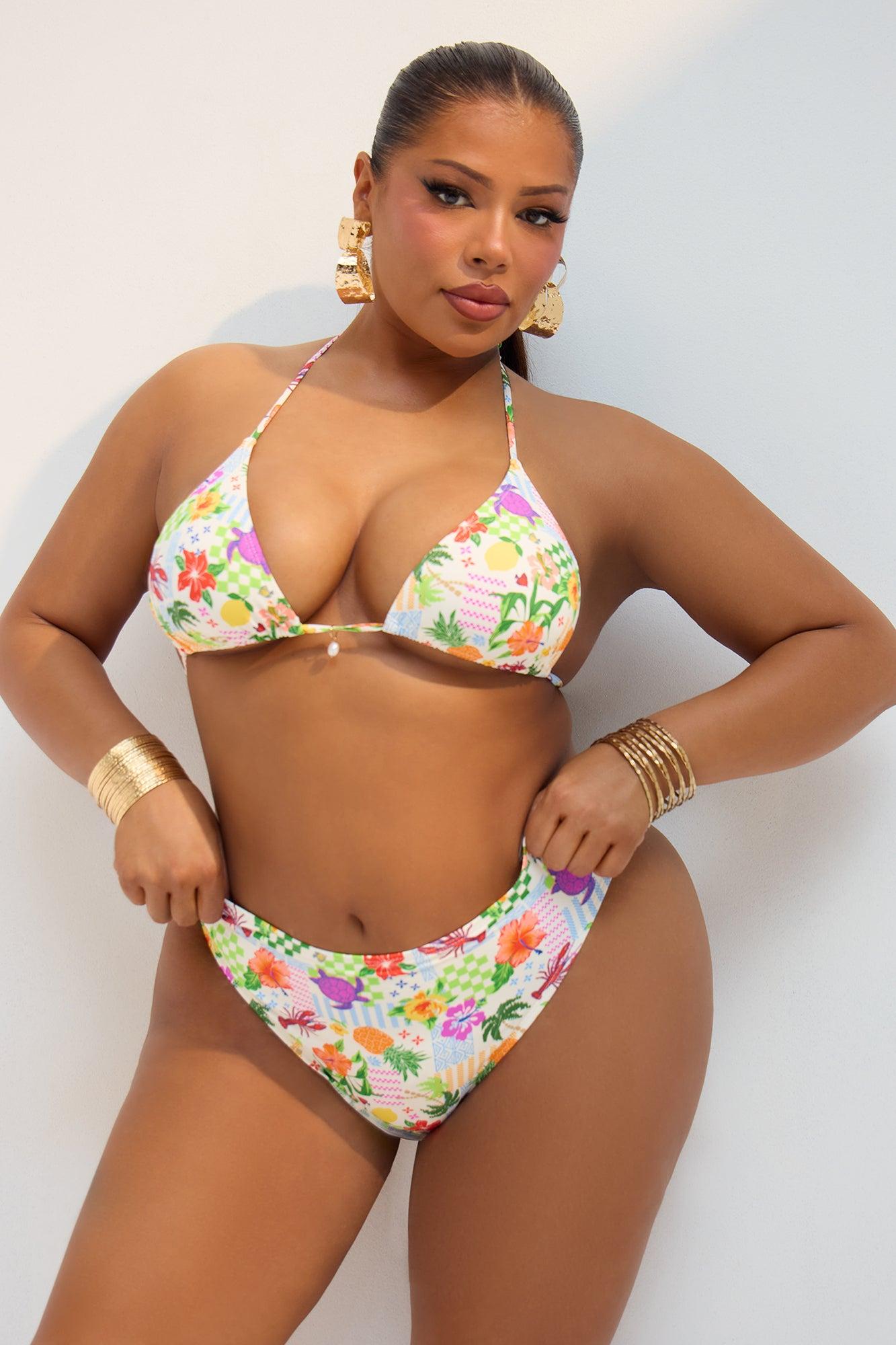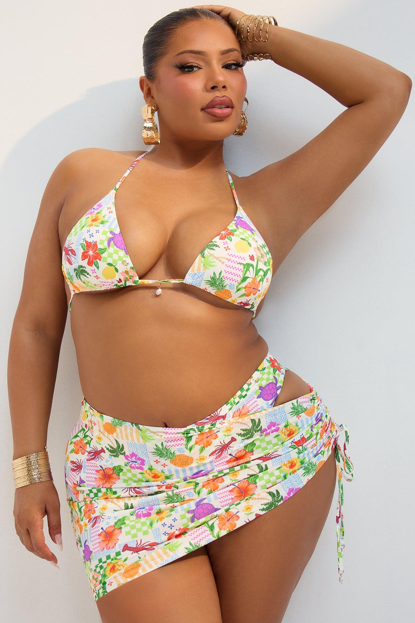 Available In Multi Color. 3 Piece Bikini Set Triangle Bikini Top Removable Cups Charm Trim Cheeky Bikini Bottom Swim Cover Up Skirt Mini Printed Mesh Adjustable Ruching Disclaimer: Print Placement May Vary Full Stretch Final Sale Shell / Lining: 86% Nylon 14% Spandex Imported