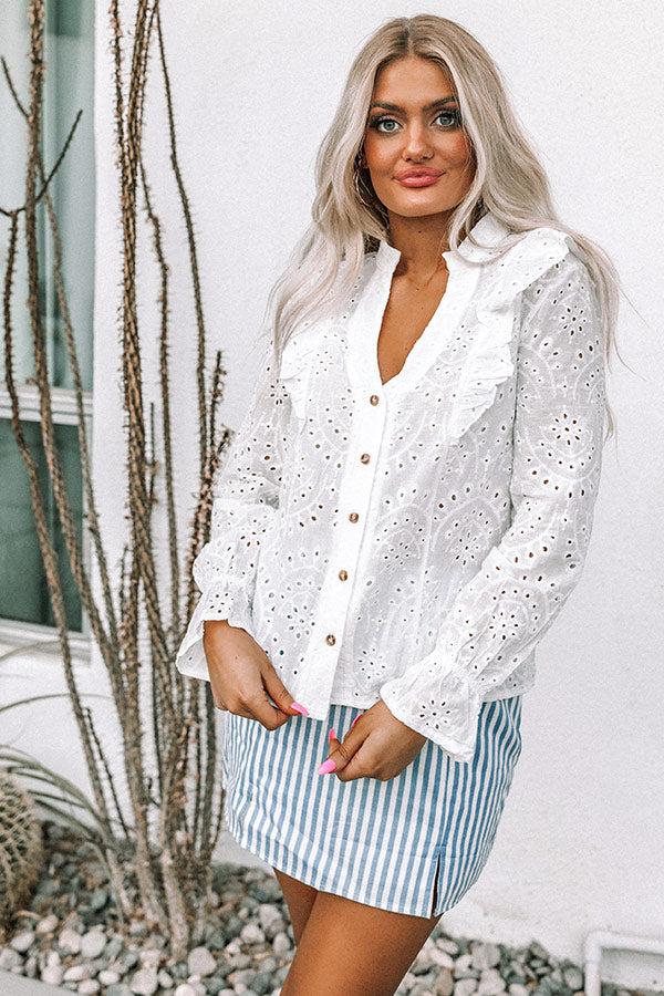 You will look amazing along the shoreline when you complete your look with this beautiful white top featuring lightweight material with delicate eyelet detailing, a button down front with a collared v-cut neckline, accent ruffles over the shoulders, long loose sleeves with subtly flared cuffs, and a flattering silhouette that ends in a straight hemline! Measurements S : Bust 36", Hip 38", Length 22", Sleeve Length 22", Waist 34". M : Bust 37", Hip 40", Length 23", Sleeve Length 22", Waist 36". L : Bust 38", Hip 42", Length 24", Sleeve Length 22", Waist 38".