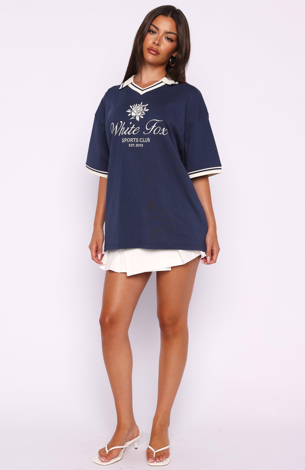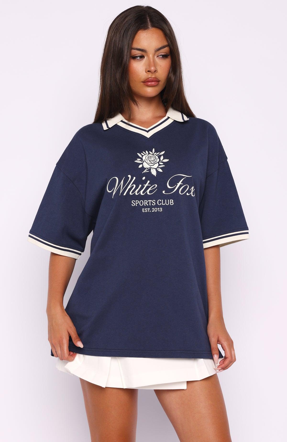 I'm nicer when I like my outfit. The Along The Way Oversized Jersey in Navy brings effortless cool to your wardrobe. Features a relaxed V-collar neckline and short sleeves with sporty stripe detailing at the cuffs. The centre front is embroidered with White Fox text paired with a rose graphic for a stylish statement. Designed with an oversized silhouette that’s perfect for laid-back days, and finished unlined. Style with a mini skort and your fav trainers for a sporty yet chic look!