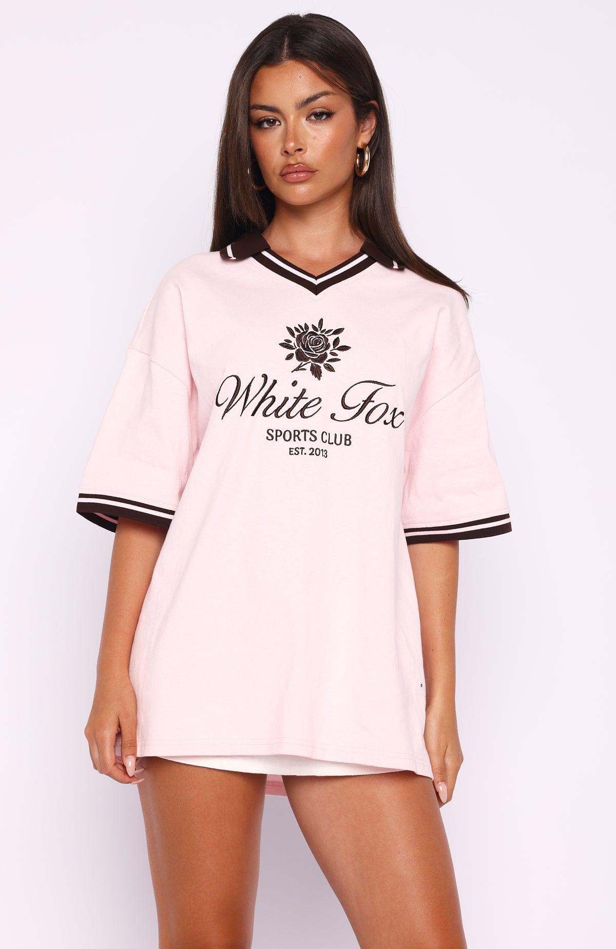 I'm nicer when I like my outfit. The Along The Way Oversized Jersey in Pink brings effortless cool to your wardrobe. Features a relaxed V-collar neckline and short sleeves with sporty stripe detailing at the cuffs. The centre front is embroidered with White Fox text paired with a rose graphic for a stylish statement. Designed with an oversized silhouette that’s perfect for laid-back days, and finished unlined. Style with a mini skort and your fav trainers for a sporty yet chic look!
