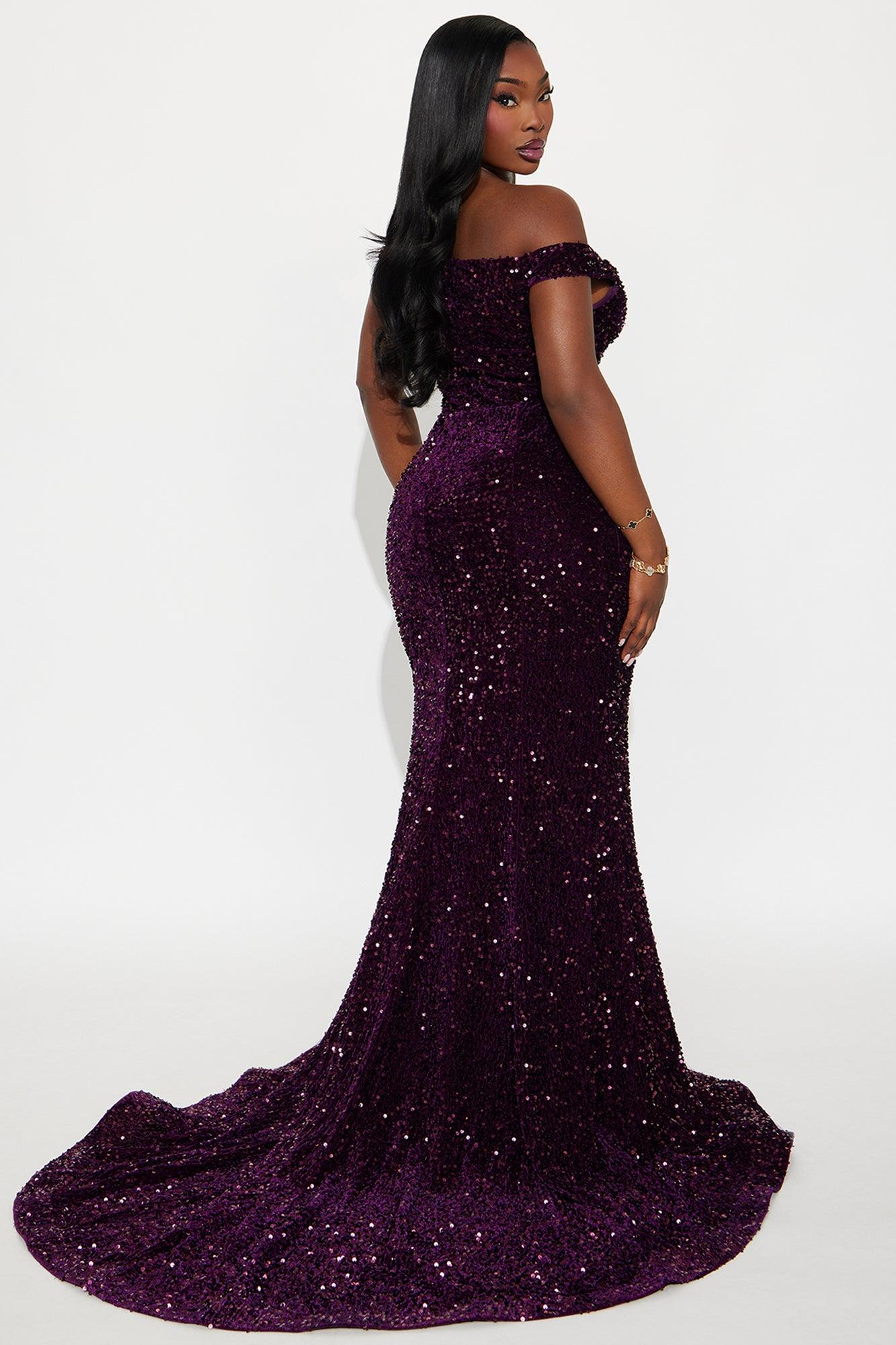 Available In Plum. Velvet Sequin Maxi Gown Off Shoulder Sweetheart Neckline Padded Bra Cups Horsehair Hem Hidden Back Zipper Dramatic Train Half Lined Stretch Self : 100% Polyester Lining : 100% Polyester Imported California Proposition 65WARNING: Cancer and Reproductive Harm - www.P65Warnings.ca.gov.