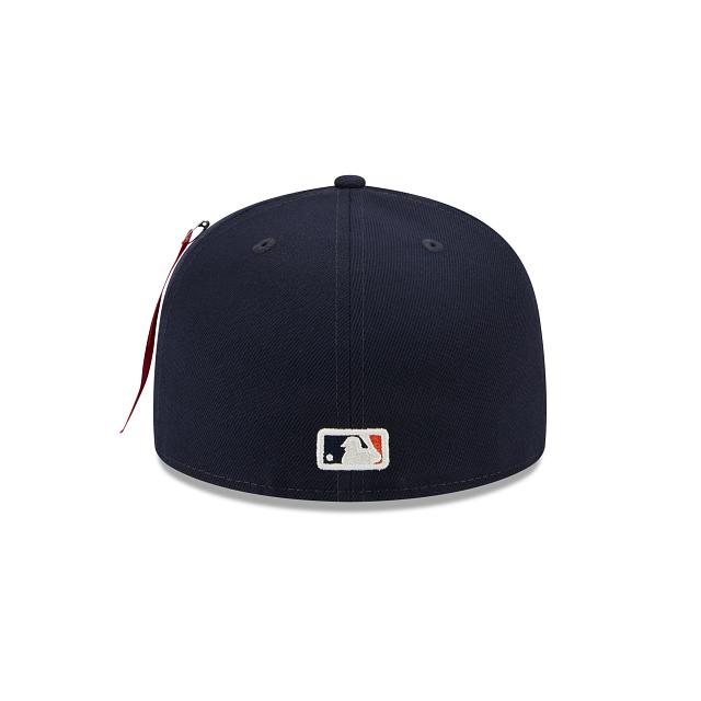 The Alpha Industries X New York Mets Dual Logo 59FIFTY Fitted Cap features embroidered Alpha Industries and Mets logos at the front panels with a matching MLB Batterman at the rear. Additional details include an Alpha Industries ribbon at the left-wear side and a gray undervisor.