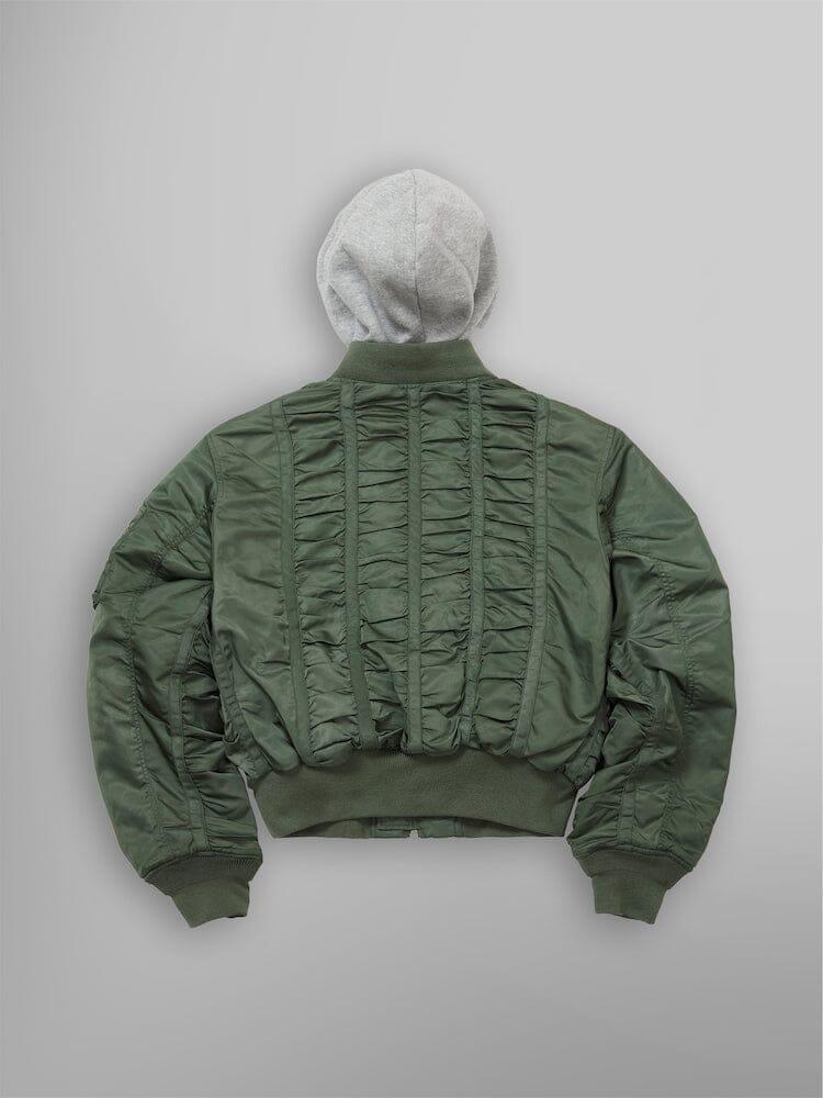 Alpha x MadeMe® Ruched MA-1 Bomber is a collaborative jacket that combines Alpha Industries' military expertise with MadeMe®'s fashion sensibilities. This jacket features a flight-satin twill with rushing details, added fleece hood, and an all-over ruching that nods to Japanese street style and British punk culture.
