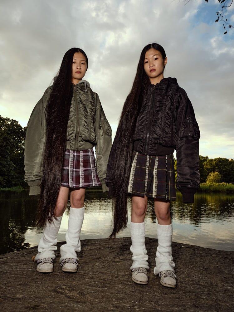 Ruching detail on front and back of jacket inspired by late 90s/early 2000s