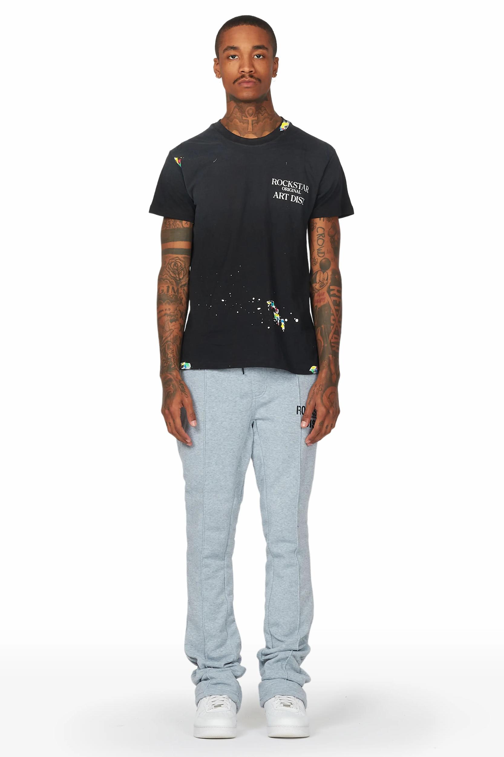 An urban athleisure stacked track pants for men in heather grey. Designed with ultra soft organic cotton and extra long legs for the perfect streetwear style. Drawstring waistband Dual slant pockets Stacked construction Flare leg openings Printed RSO logo 35.75" seams *NOTE: These pants are purposefully designed with extra long legs so the fabric properly bunches at the hem, creating the stacked flare style.