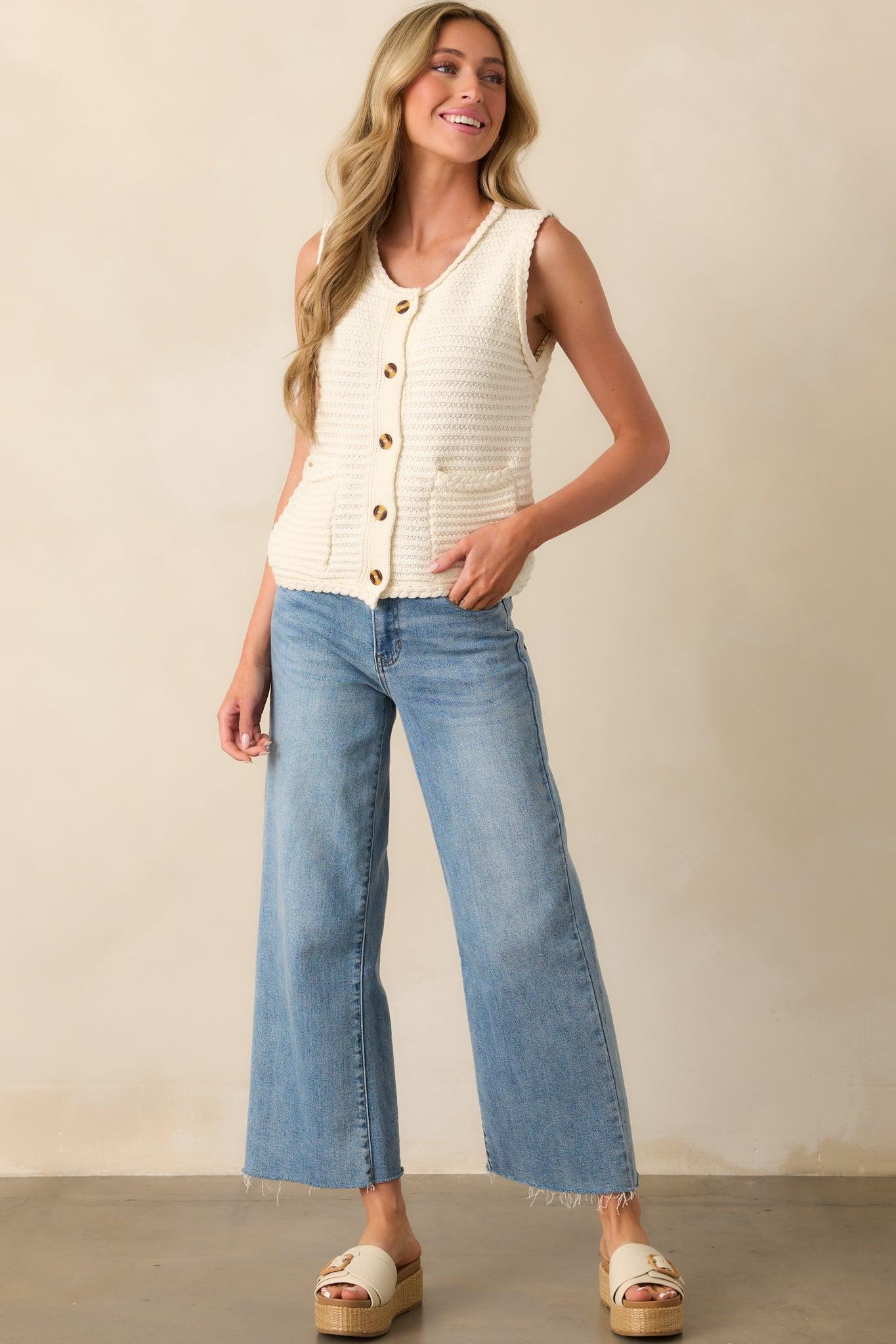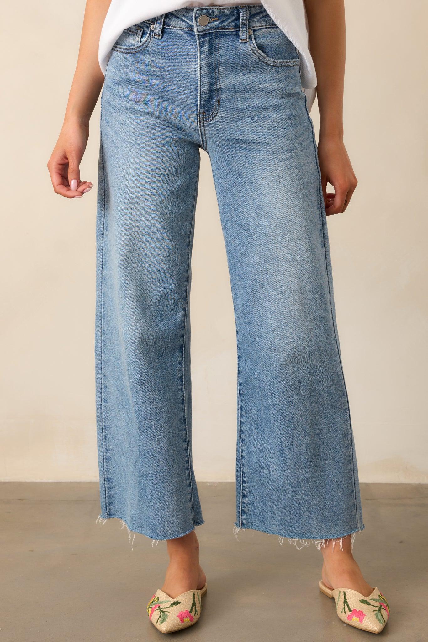Stride confidently in our Already On It Light Wash Wide Leg Jeans. These chic and comfortable jeans offer a modern take on a classic silhouette, perfect for those who appreciate both style and ease. The light wash adds a touch of casual cool, while the wide leg design ensures a flattering fit. Versatile and stylish, these jeans will keep you feeling confident and ready for anything. These light wash jeans feature a raw bottom hem, slightly cropped length, functional pockets, belt loops, wide leg design, and classic zipper & button closure. 93% Cotton, 5% Polyester & 2% Spandex Unlined Hand Wash Cold Manufactured in Vietnam Designed in The USA Model is 5'8" and is wearing a size 24