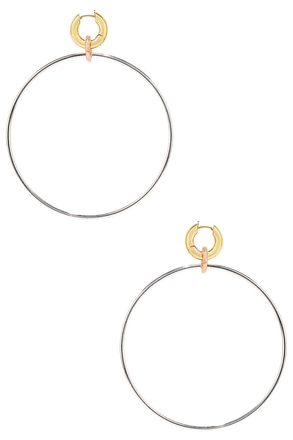 Spinelli Kilcollin Altaire Custom Hoop Earrings in Metallics Made of sterling silver, the Altaire Custom Hoop earrings are accented with an 18K solid yellow gold ring.. Made in USA. Earring set. Measures approx 57mm/ 2.25 inch in diameter. Huggie closure. SLKN-WL38. E-ALTFWRD. About the designer: Yves Spinelli set out to create a minimal and architectural inspired fine line of jewelry with a cool yet timeless aesthetic. Partnering with artist Dwyer Kilcollin in 2010, Spinelli Kilcollin was born. Designed and crafted in Los Angeles, the brand found immediate success in their interlocking multi-band ring design which featured various sizes that could be styled a number of ways making it all your own. Using polished metals and precious stones accented with pave diamonds, the edgy yet iconic pieces represent a contemporary minimalism with intricate craftsmanship and materials that aspires to become a leading voice in the luxury jewelry industry.