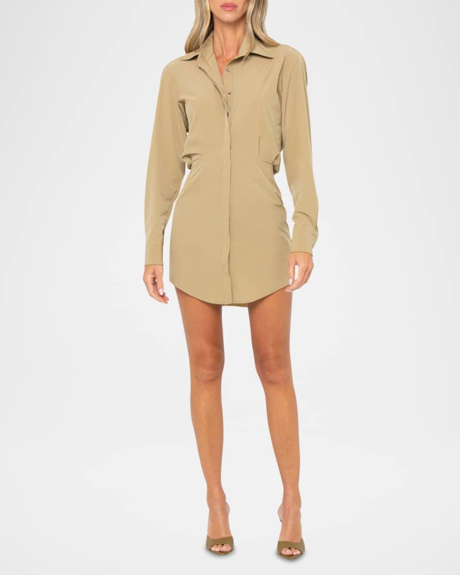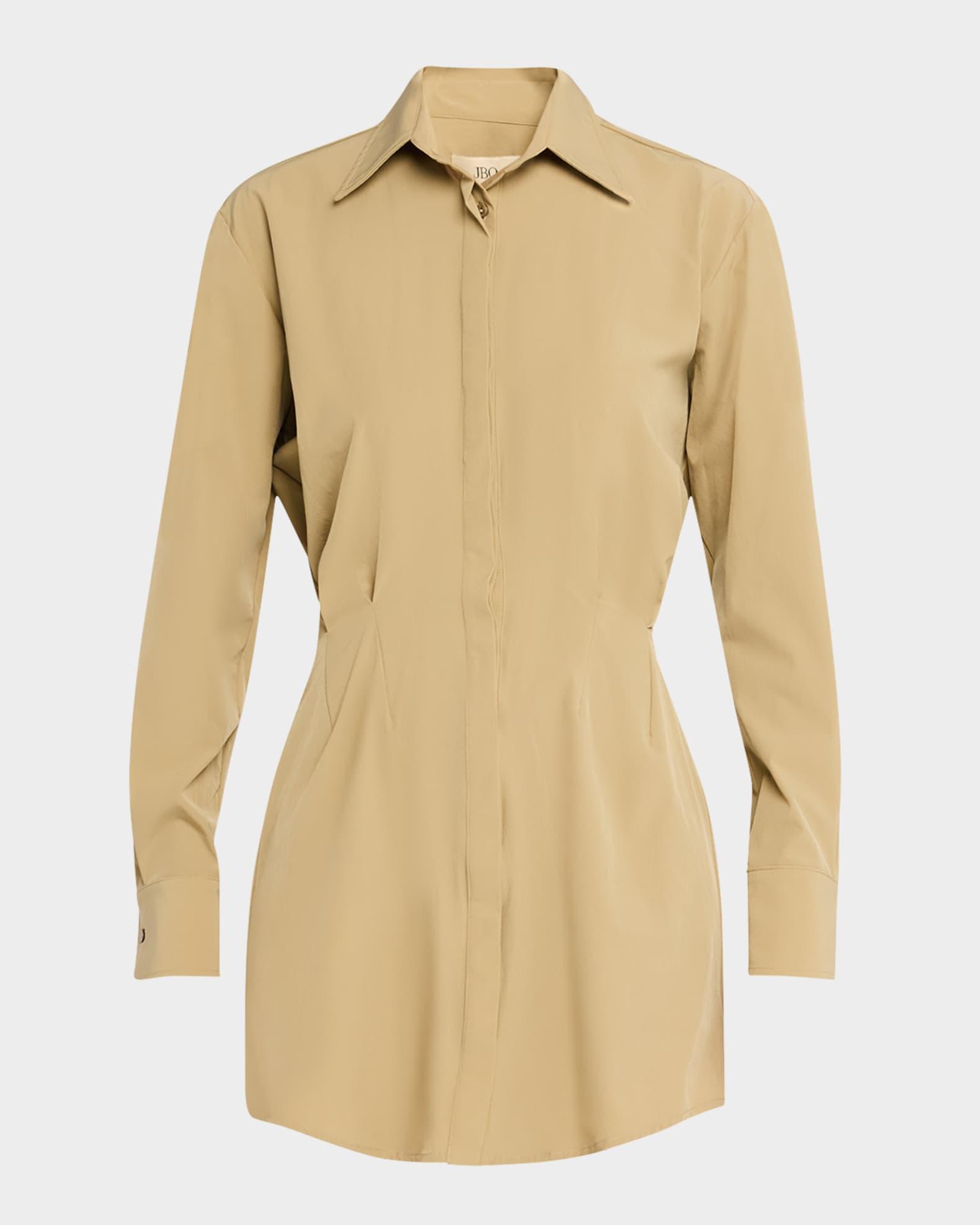 JBQ "Althea" solid shirtdress Approx. 34"L from shoulder to hem Spread collar; button front Long sleeves; button cuffs Cinched waist Side seam pockets Yoked back Hem falls above the knee Nylon/polyamide/spandex Made in USA from imported materials Model is 5'10"/177cm.