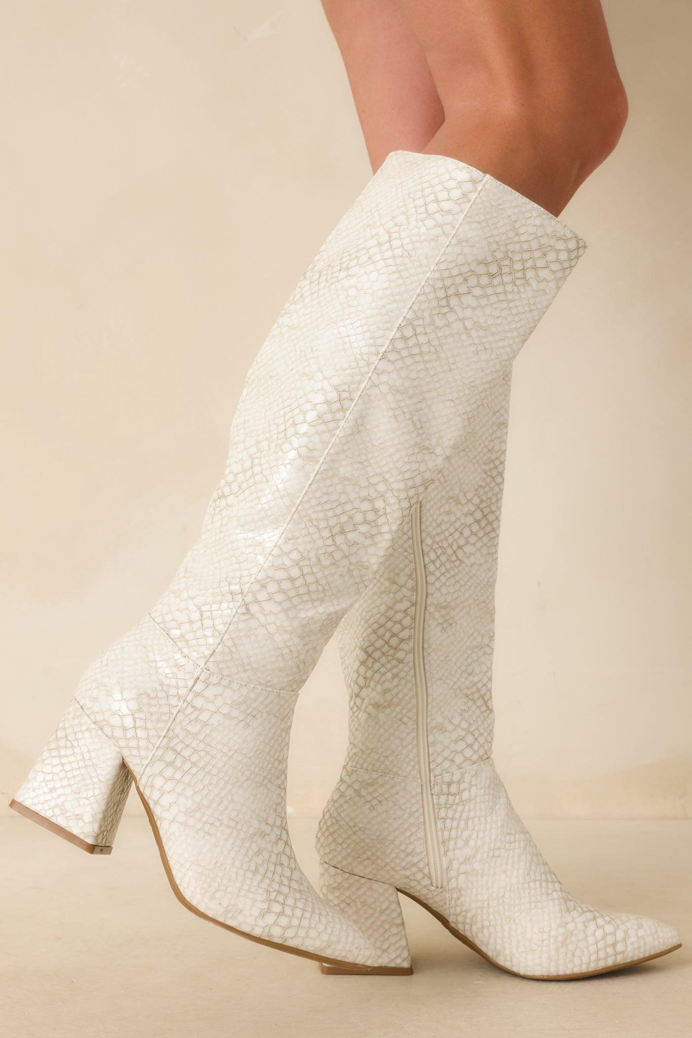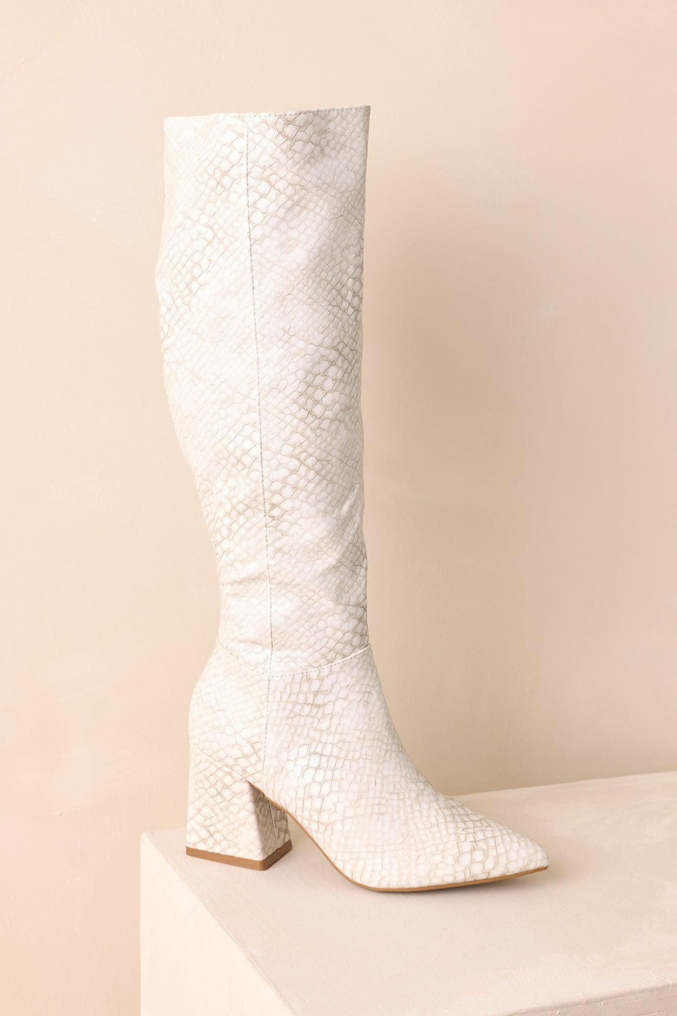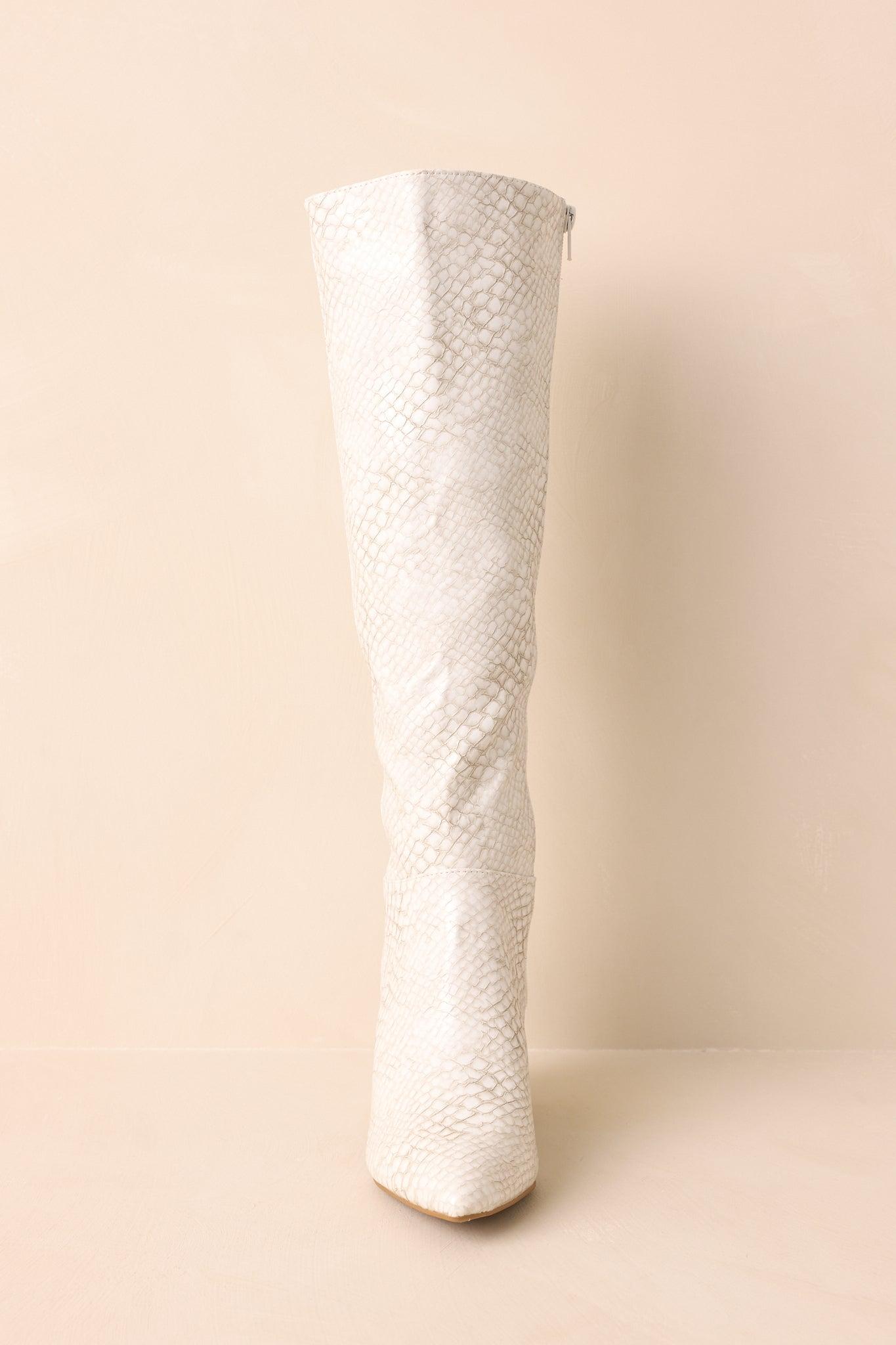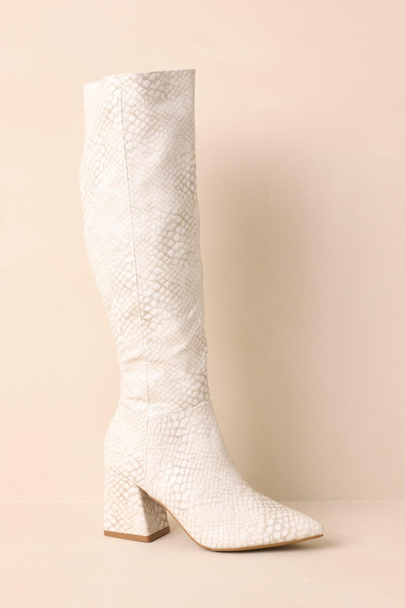 The Always A Step Ahead Ivory Faux Snakeskin Knee High Boots give every step a bold, confident edge, adding that sleek, modern touch that instantly elevates your look and keeps you stylishly ahead of the crowd. These ivory boots feature a snakeskin embossed faux leather material, a pointed toe, block heel, inside functional zipper closure, and a paneled design. Heel measures 3" Man made materials Non-skid sole Manufactured in China Designed in The USA True to Size, Wide Foot Friendly