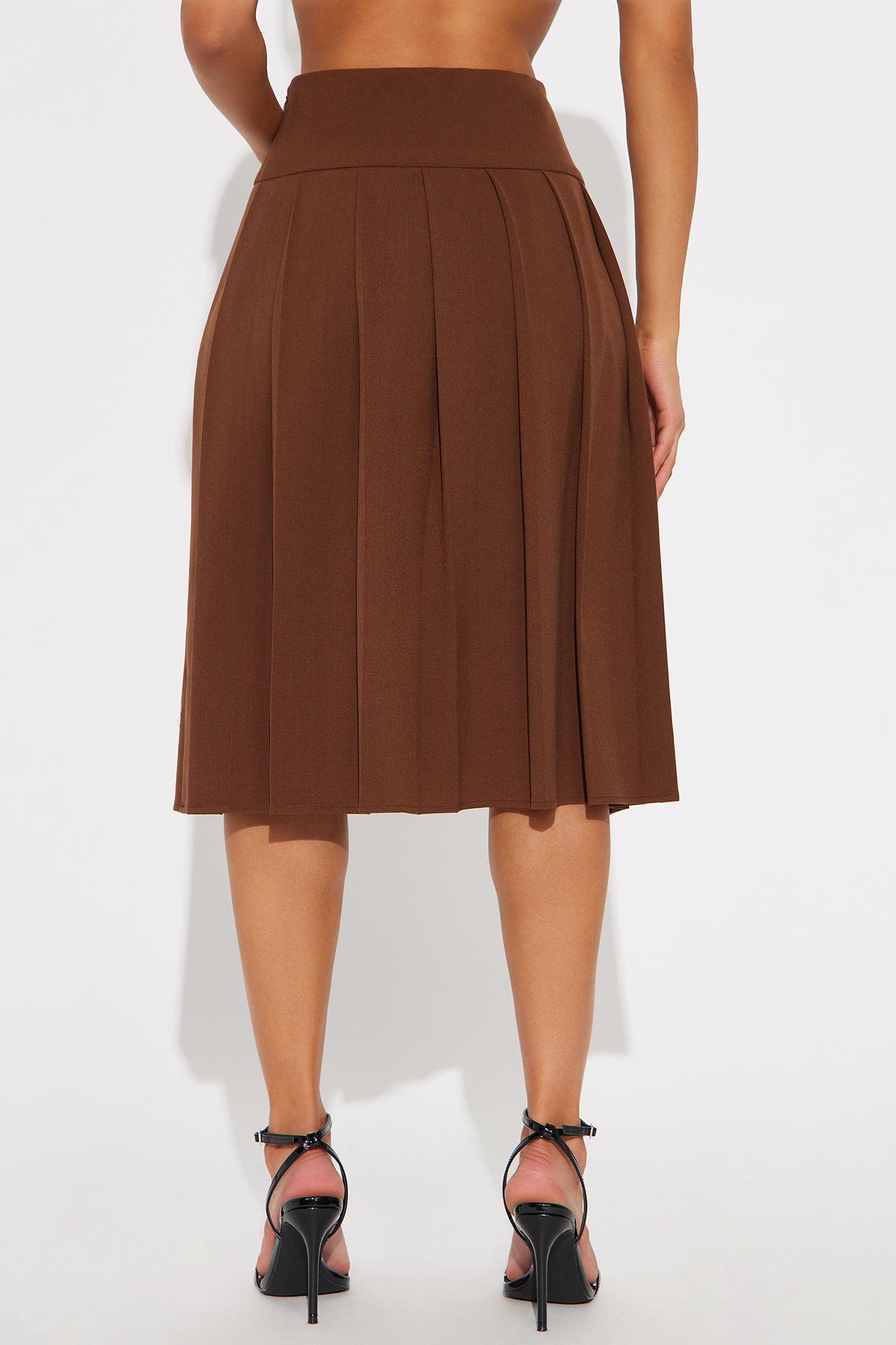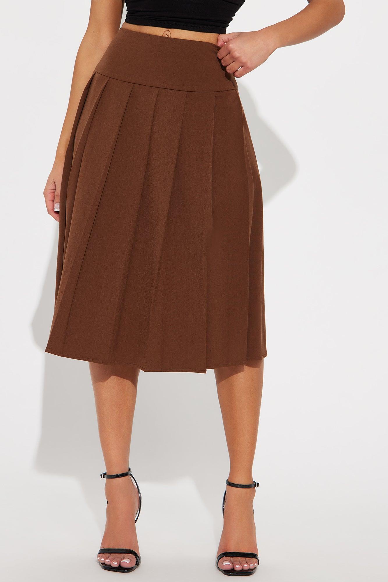 Available In Mocha. Midi Skirt High Rise Side Zip Closure Pleated Stretch 66% Polyester 30% Rayon 4% Spandex Imported