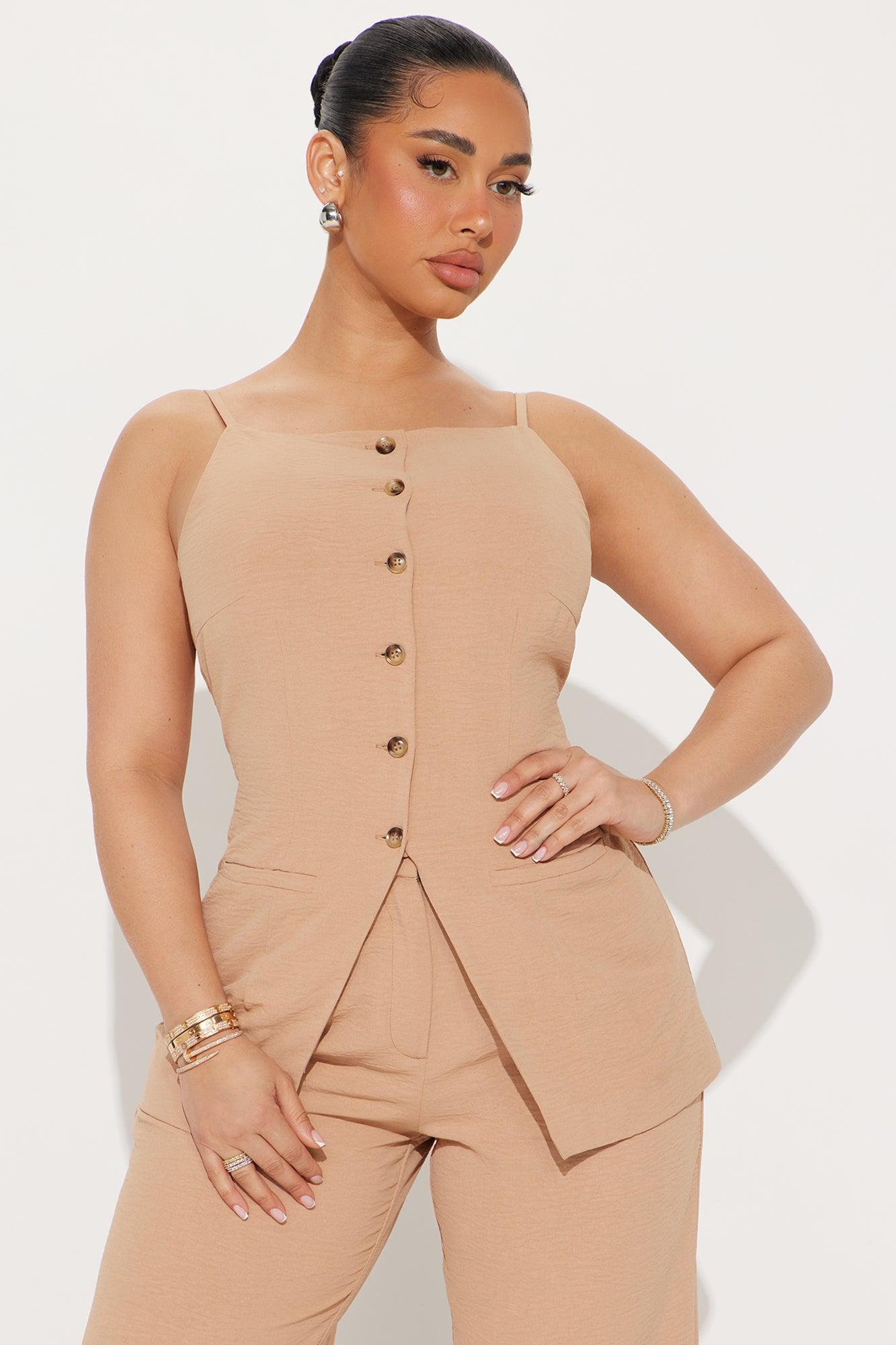 Available In Slate Blue, Taupe, And Black. Sleeveless Top and Pant Set Stretch Regular 33" Inseam Front Zip Closure Pockets Self:95%Polyester 5%Spandex Lining:100%Polyester Imported