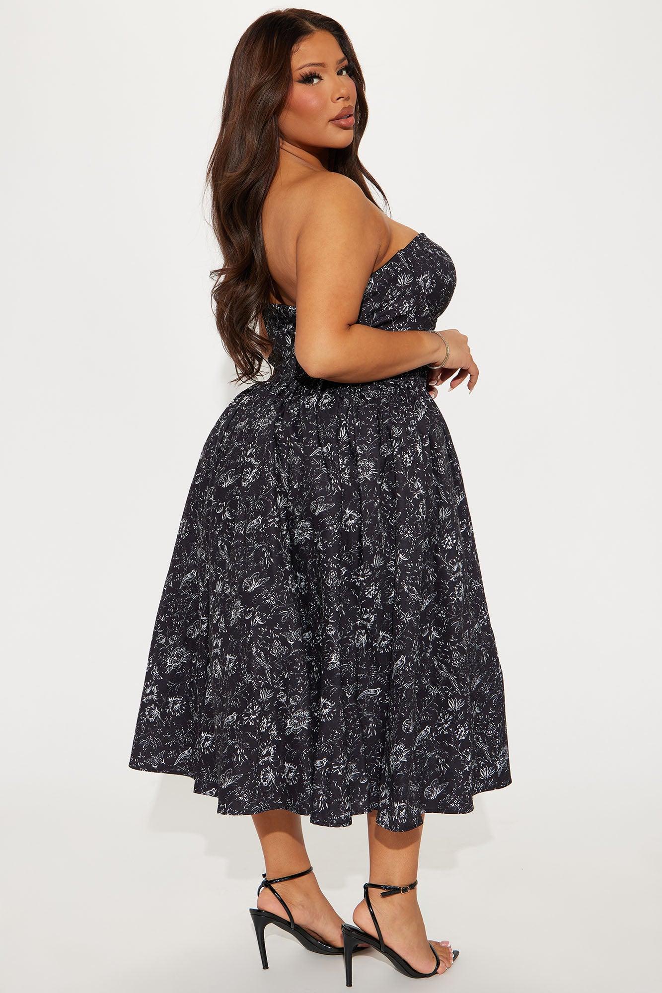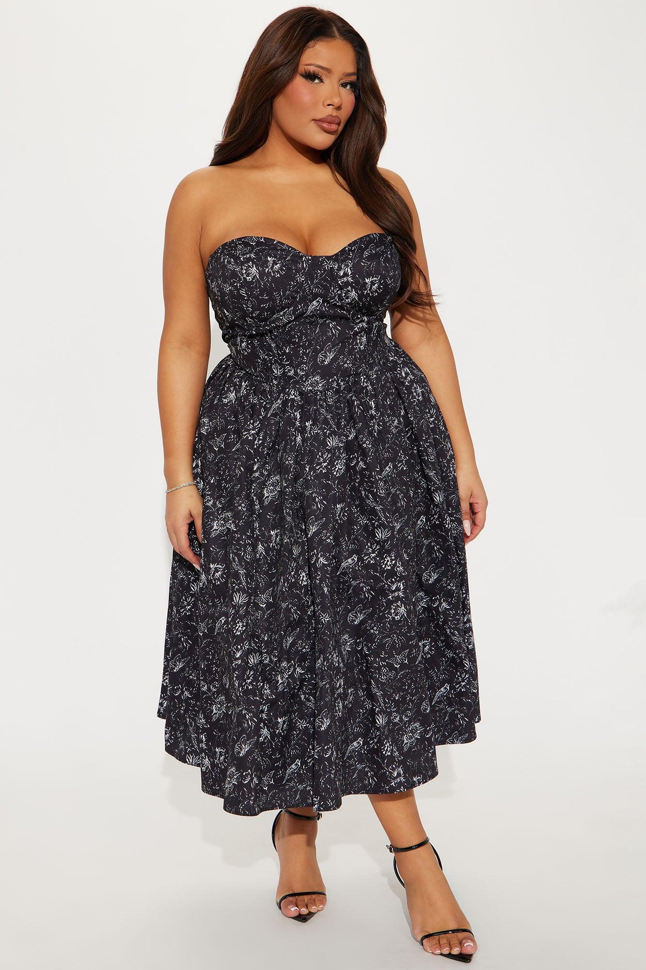Available In Black/White And White/Blue. Strapless Midi Dress Sweetheart neckline Strapless Padded bra cups w/ underwire Faux corset waist Back zipper Lined Length measured flat = 38" Disclaimer Print Placement May Vary Shell: 96% Polyester 4% Spandex Lining 1: 100% Polyester Lining 2: 100% Polyester Imported