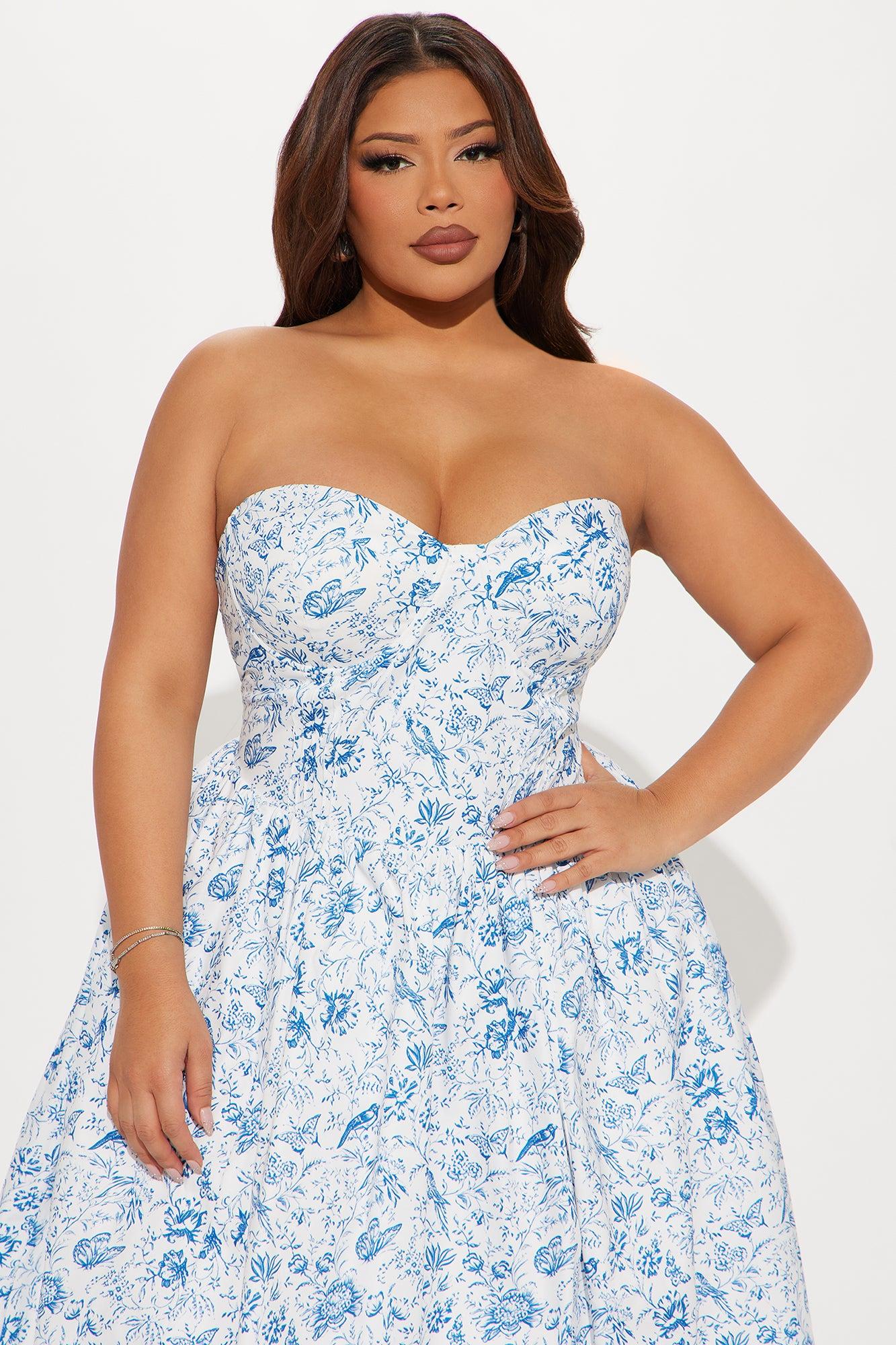 Available In Black/White And White/Blue. Strapless Midi Dress Sweetheart neckline Strapless Padded bra cups w/ underwire Faux corset waist Back zipper Lined Length measured flat = 38" Disclaimer Print Placement May Vary Shell: 96% Polyester 4% Spandex Lining 1: 100% Polyester Lining 2: 100% Polyester Imported