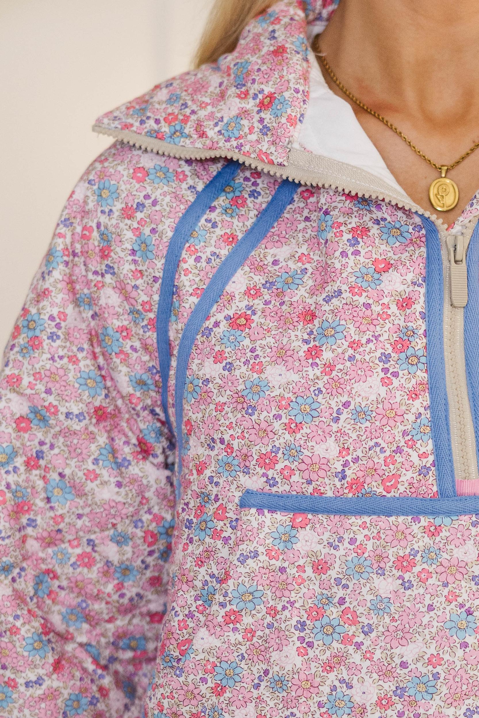 This floral pullover brings a sporty-meets-sweet feel to your everyday wardrobe with its fresh print and polished details. Designed with a relaxed fit and half-zip neckline, it’s perfect for layering on cool days or wearing on its own for an easy, pulled-together look. Comfortable and cute, it’s a go-to for casual outings and everyday wear. Collared neckline with half-zip closure Long sleeves with relaxed fit Banded hemline Soft, midweight fabric Moderate stretch Baileigh is wearing the small.