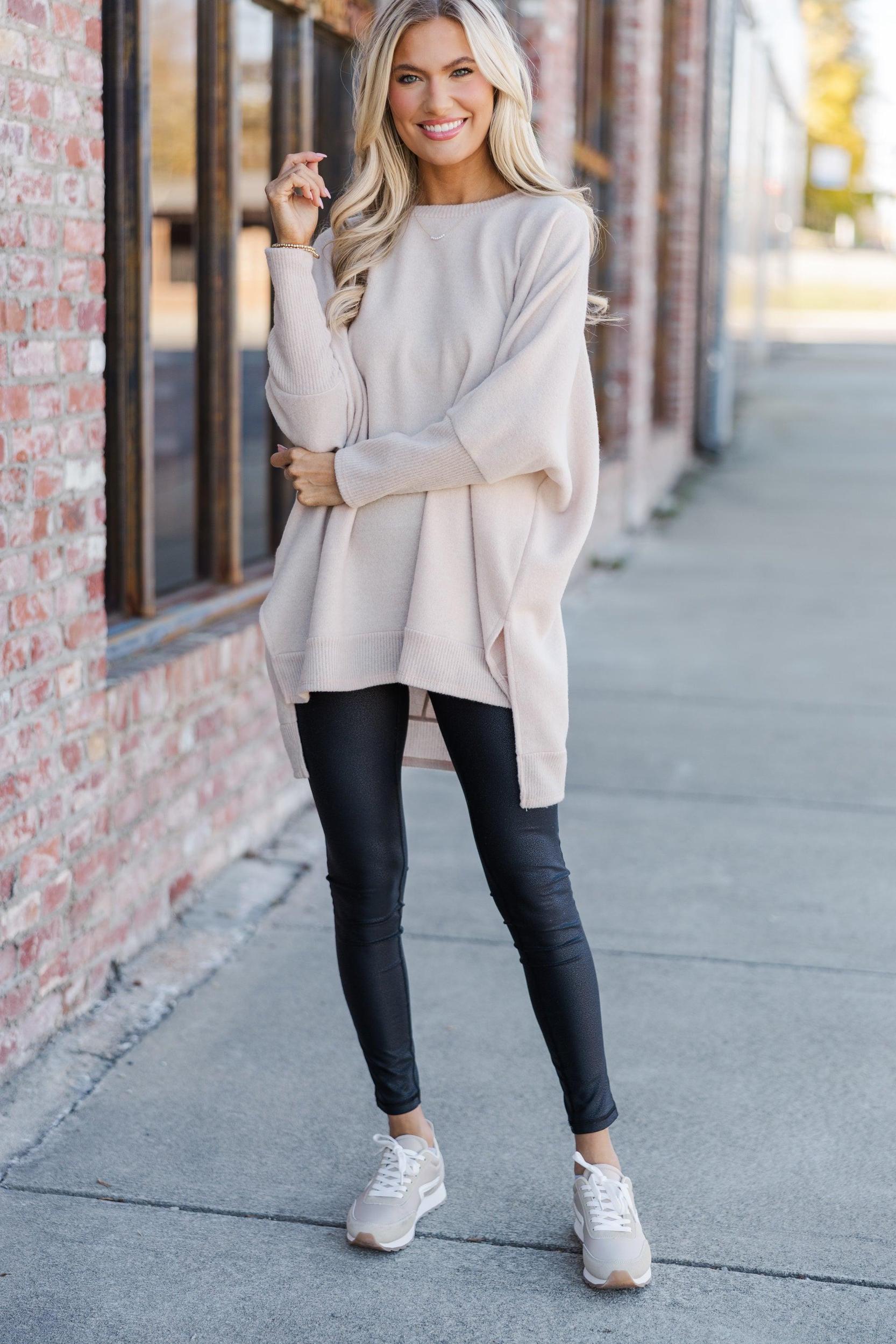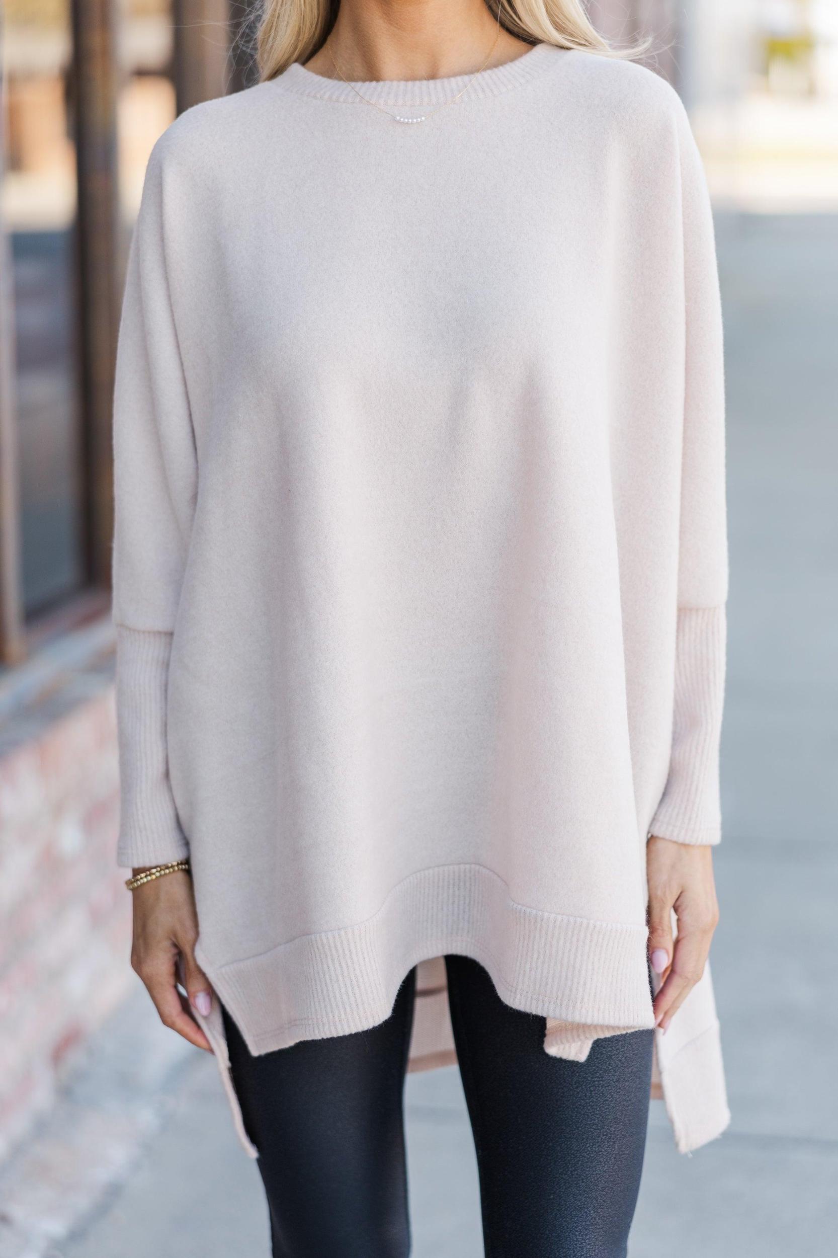 This classic, versatile tunic will always be fun! It's so soft and comfy! Those dramatic side slits are really cute and make this tunic very flowy. This tunic is going to look great with leggings and sneakers for a casual day of running errands. Round neckline Long sleeves with drop shoulders Side slits Brushed knit fabric Generous stretch Baileigh is wearing the small.