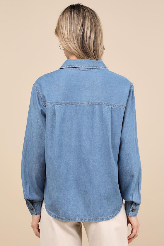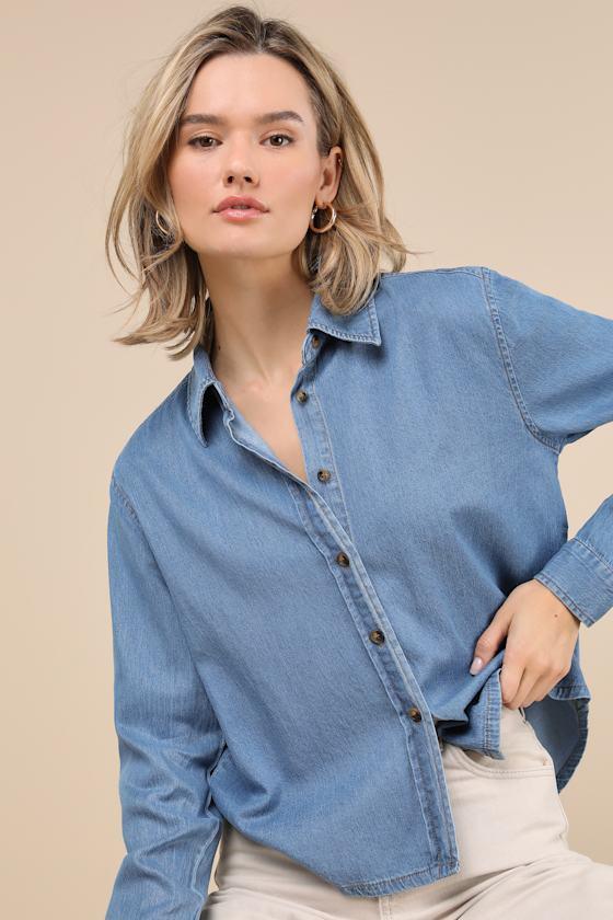 It's easy to put together a perfectly chic look when you have the Lulus Always Pristine Medium Blue Chambray Button-Up Top! Lightweight, cotton-blend woven chambray shapes this classic top that features a collared neckline and long sleeves with subtle drop shoulders and button cuffs. The relaxed bodice boasts a functional button placket along the center that ends at a rounded hem.