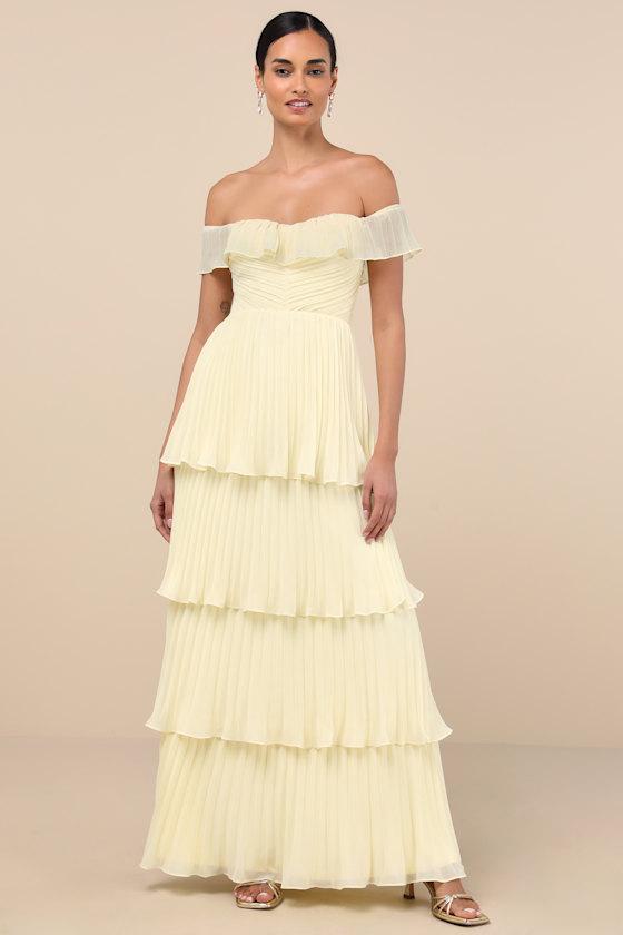 With the Lulus Always Remarkable Pale Yellow Off-the-Shoulder Maxi Dress, it's inevitable that compliments will follow you all night long! Airy, pleated woven chiffon shapes a lightly gathered bodice with hidden no-slip strips and a sweetheart-style neckline adorned with ruffled trim that flows into fluttery, off-the-shoulder straps (with elastic at the shoulders). The high, fitted waist tops a tiered, A-line skirt that cascades down to a sweeping maxi hem. Hidden back zipper/clasp.