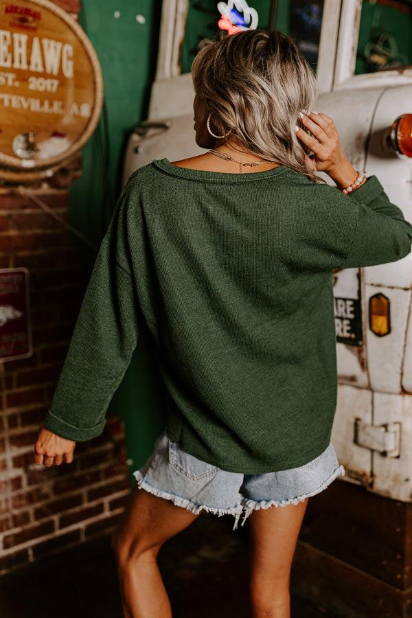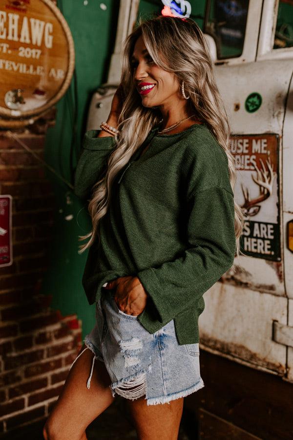 - This trendy top is giving fall energy! - Unlined knit material with a ribbed texture - A v-cut neckline with an accent patch - Long, loose sleeves with rolled cuffs - Unfinished seam details - A relaxed silhouette that ends in a straight hemline with accent side slits