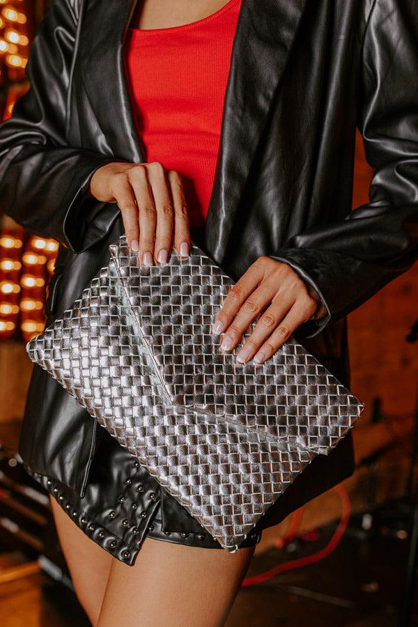 - This trendy clutch is the perfect accessory for a chic look! - Woven silver colored metallic material - Silver colored hardware - A fully lined rectangular pouch with zip closure as well as magnetic flap closure - An interior zip closure pocket - A detachable chain shoulder strap