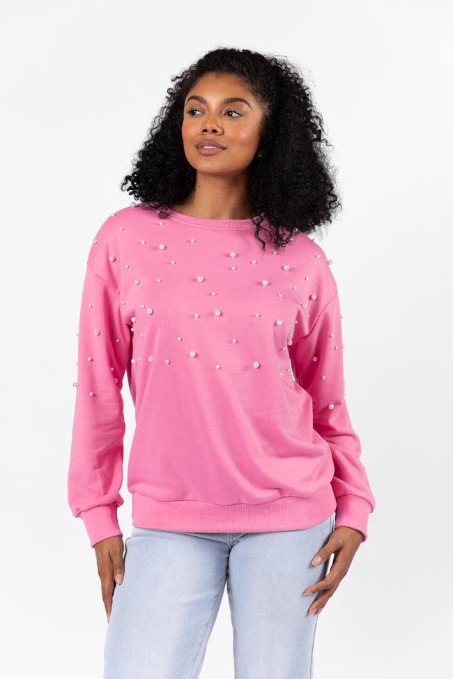 Details Pink Pearl Embellished Pullover Fabric has stretch Crew neckline, ribbed hem, pearl embellishments Unlined Size small from shoulder to hem: 23" Material and Care 70% polyester 30% cotton Machine wash cold, line dry Patterns may vary Materials may have natural variations Colors may vary from different viewing devices.