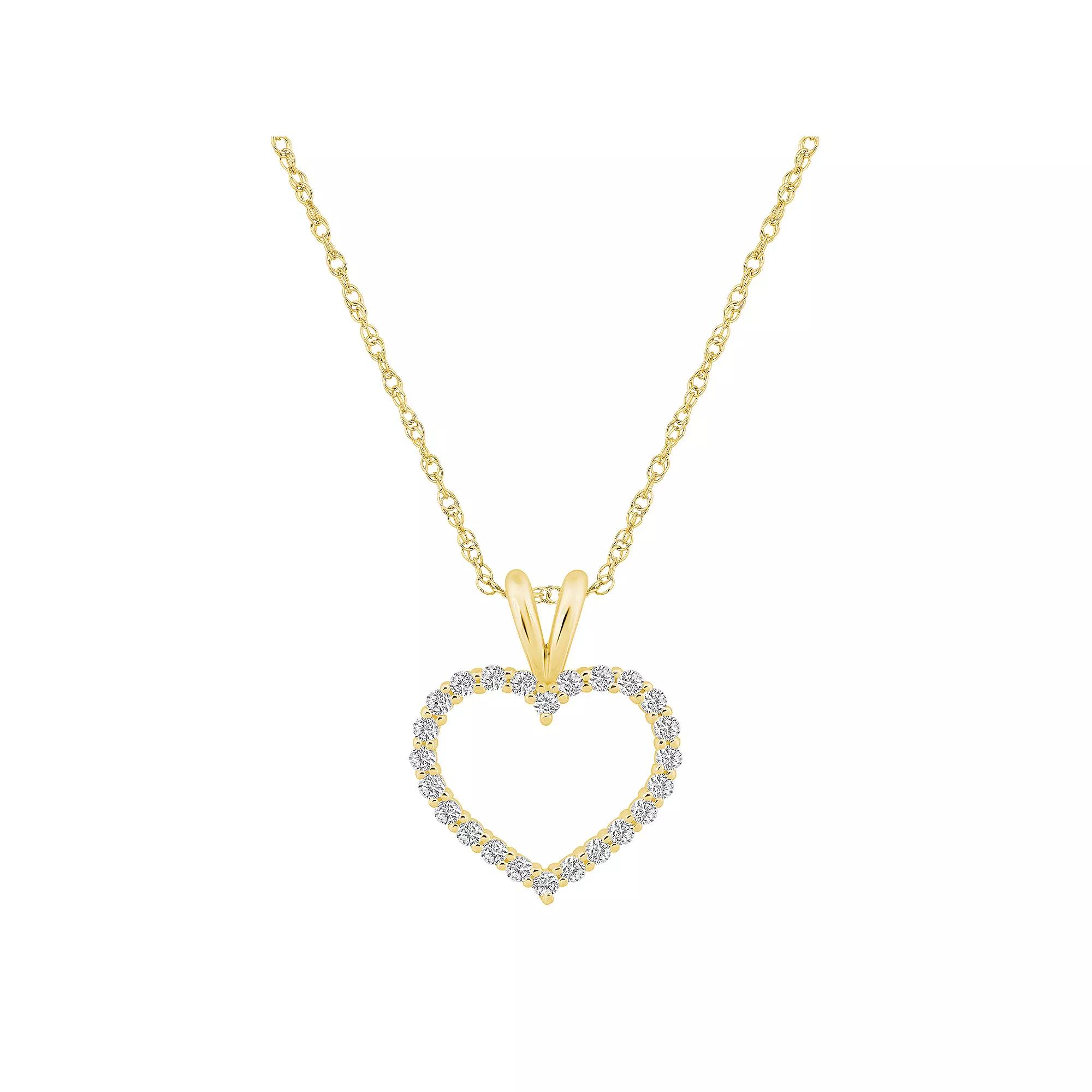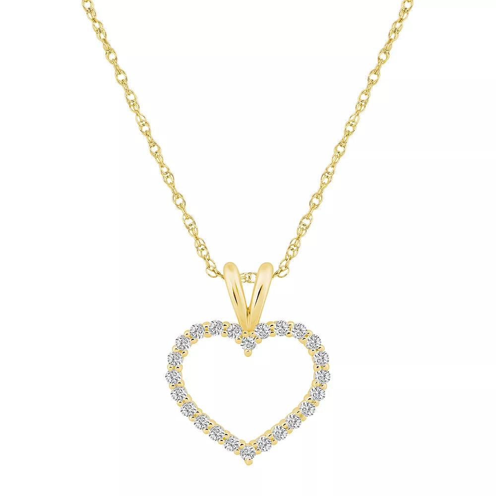 Show her how much she means to you with this diamond-studded Alyson Layne 14k gold open heart pendant necklace. Show her how much she means to you with this diamond-studded Alyson Layne 14k gold open heart pendant necklace. Chain length: 18 in. Chain type: rope Pendant size: 5/8 in. x 1/2 in. Nickel free Metal: 14k gold Plating: rhodium Finish: polished Packaging: boxedDIAMOND DETAILS Total weight: 1/4 ct. Color grade: H, I Clarity grade: I2, I3 Shape: round Setting: prong Diamond weights are approximate. Diamond Total Weights may vary between .01 and .13 ct. Some diamonds consist of fewer than 17 facets. Image(s) may be enlarged to show detail. Please note, due to the high value of this item, a signature may be required upon delivery. Size: 18. Color: Yellow. Gender: female. Age Group: adult.