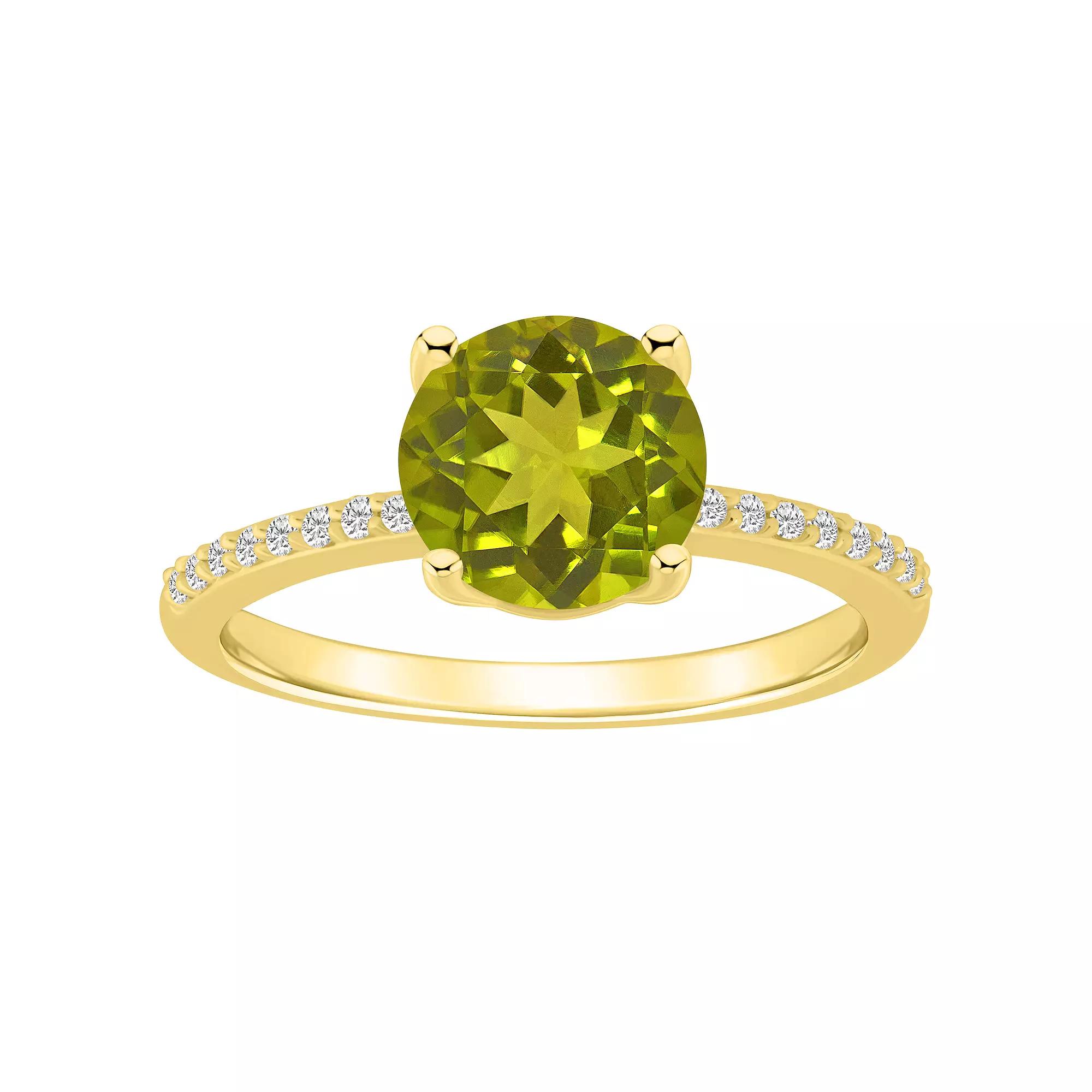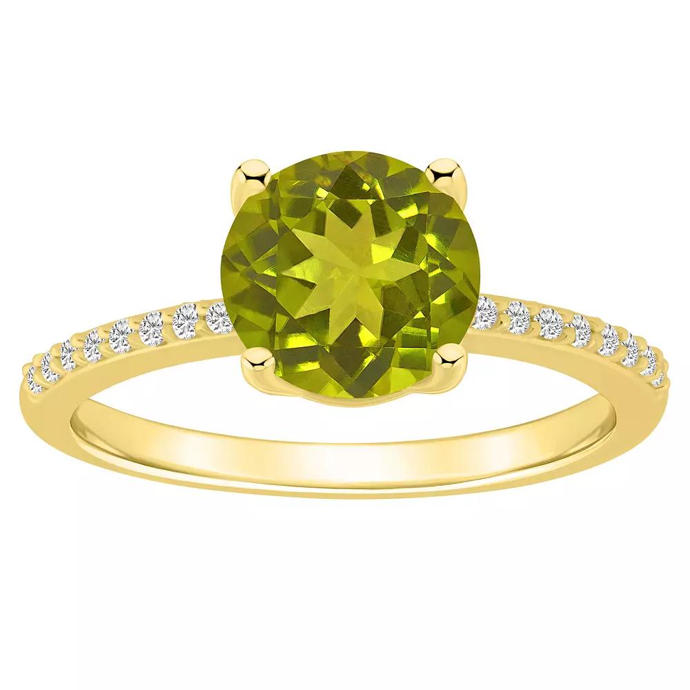 With shimmering peridot and genuine diamonds, this 14k gold Alyson Layne ring is an accessory you'll love. With shimmering peridot and genuine diamonds, this 14k gold Alyson Layne ring is an accessory you'll love. Nickel free Metal: 14k gold Packaging: boxed Width: 0.31 in. Finish: polishedSTONE DETAILS Stone type: peridot Total weight: 2 1/10 ct. Stone size: 8 mm Shape: round Setting: prongDIAMOND DETAILS Total weight: 1/10 ct. Color grade: I-J Clarity: 12 Shape: round brilliant Setting: prong Diamond weights are approximate. Diamond Total Weights may vary between .01 and .13 ct. Some diamonds consist of fewer than 17 facets. Gemstones may have been treated to enhance their appearance. Special care may be required. Please visit our Gemstone Treatment & Special Care Guide for more information. Image(s) may be enlarged to show detail. Please note, due to the high value of this item, a signature may be required upon delivery. Size: 6. Color: Green. Gender: female. Age Group: adult.