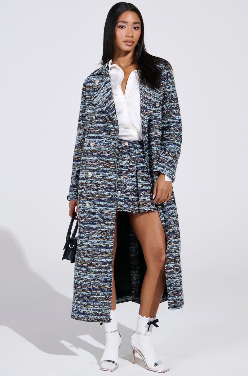 Mirror, mirror, on the wall, who’s the preppiest of them all? You will be, in The AKIRA Label Alzura Tweed Trench. Crafted from a soft, non-stretch tweed fabrication interwoven with shimmering metallic detailing, this posh piece features an oversized, longline silhouette, a notch-lapel collar, long button-cuff sleeves, spacious side-seam pockets, and decorative, intricately embossed silver mock buttons on the front. It’s finished with smooth interior lining and an adjustable, detachable waist belt for a cinched fit. Complete your look with the coordinating Alzura Tweed Mini Skirt. - Main: 100% Polyester, Lining: 97% Polyester, 3% Spandex- Spot Clean Only- No Stretch- Imported (all measurements approximate from size small)- 49.5” Shoulder to Hem- 15” Shoulder to Shoulder- 24.5” Sleeves- Model is 5’8” and wearing a size smallProduct ID: 1038428 (all measurements approximate from size 1X)- 51.5” Shoulder to Hem- 17” Shoulder to Shoulder- 26” SleevesProduct ID: 1038432