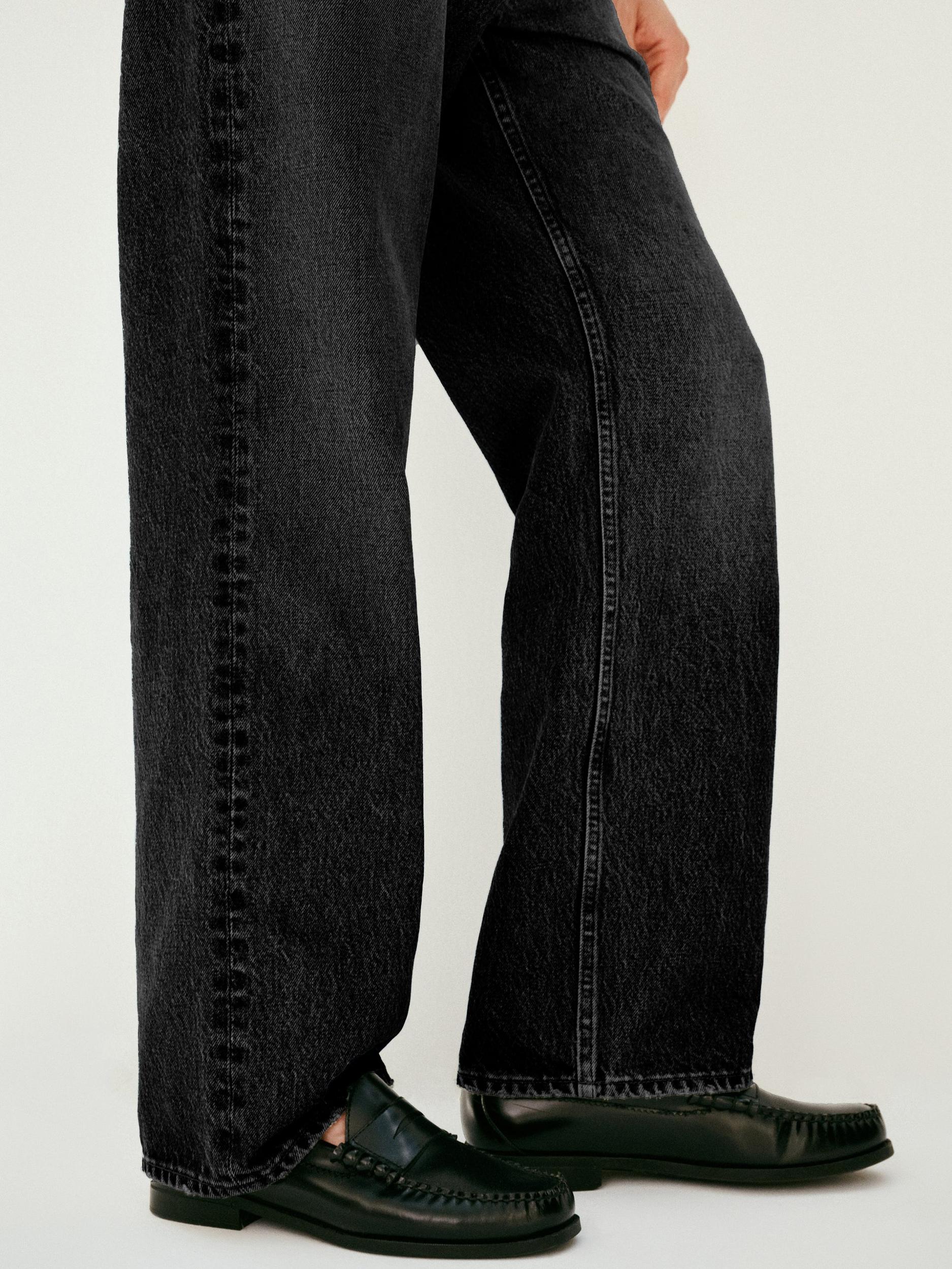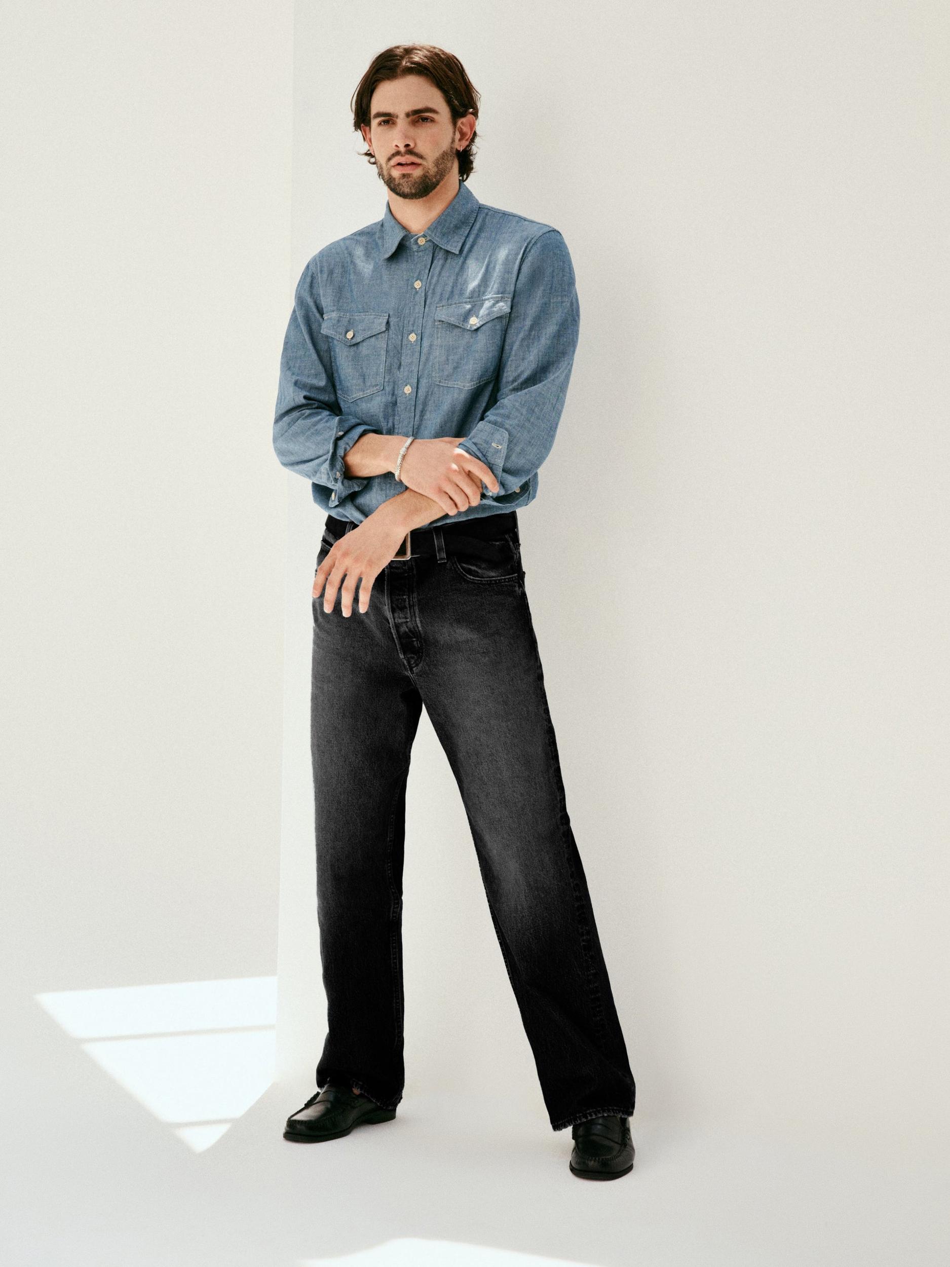 If you like a ‘90s silhouette with a wider leg, these are the ones. 12” rise meant to sit lower on hips. 32" inseam Button fly 15-ounce 100% non-stretch cotton. Fits true to size. If you're in between sizes we recommend sizing up. Gordon and Raphael are 6’1” and wearing a size 32 Size 32 measures 35" around the waist a