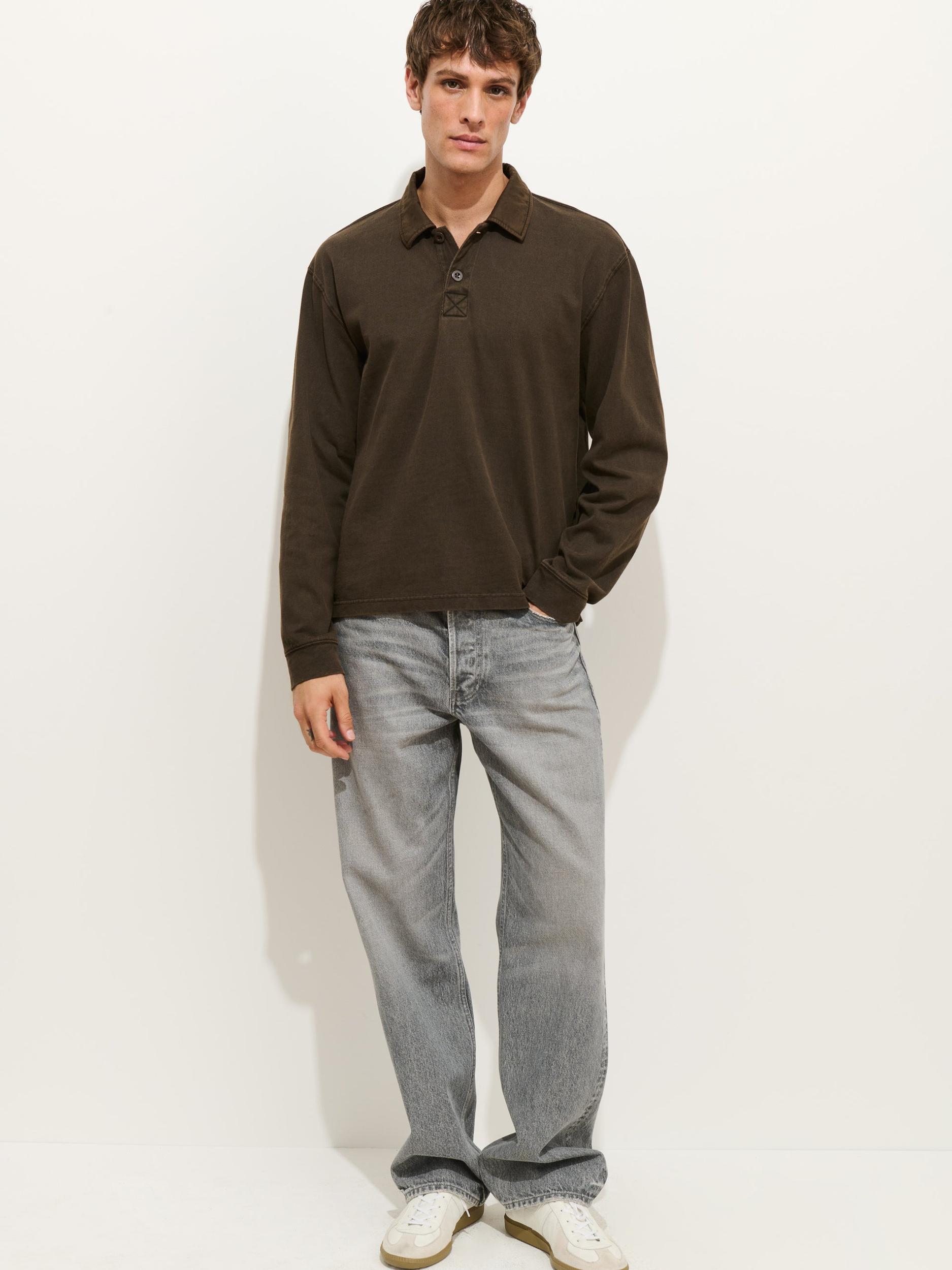 Classic ‘90s fit straight leg Jeans in Grey 15-ounce denim with a vintage wash 12”, rise meant to sit lower on hips. 32" inseam Button fly 15-ounce 100% non-stretch cotton. Fits true to size. If you're in between sizes we recommend sizing up. Conrad is 6’2” and wearing a size 32 Size 32 measures 35" around the waist an