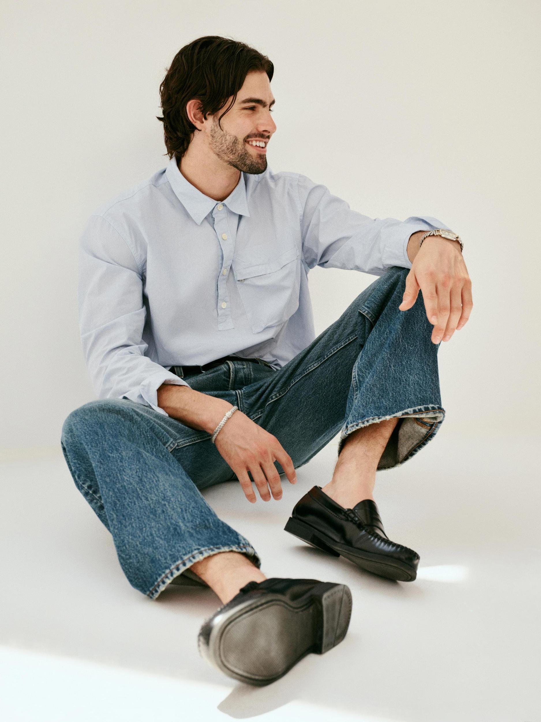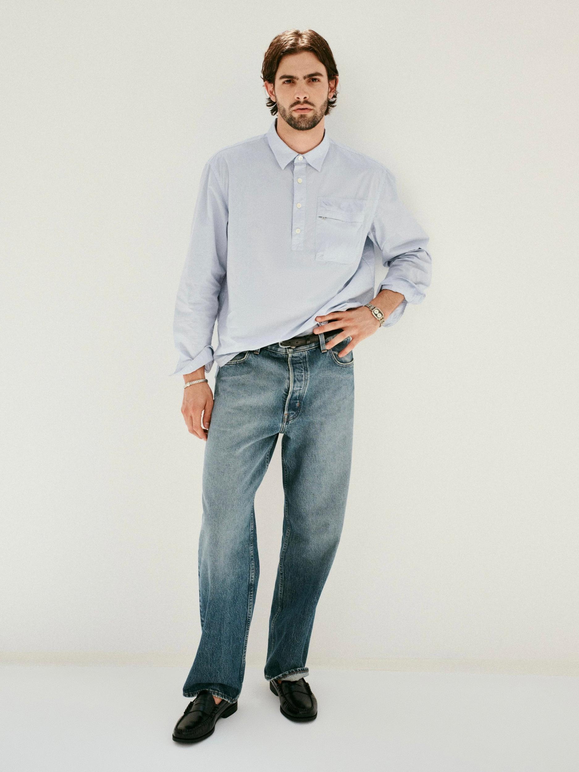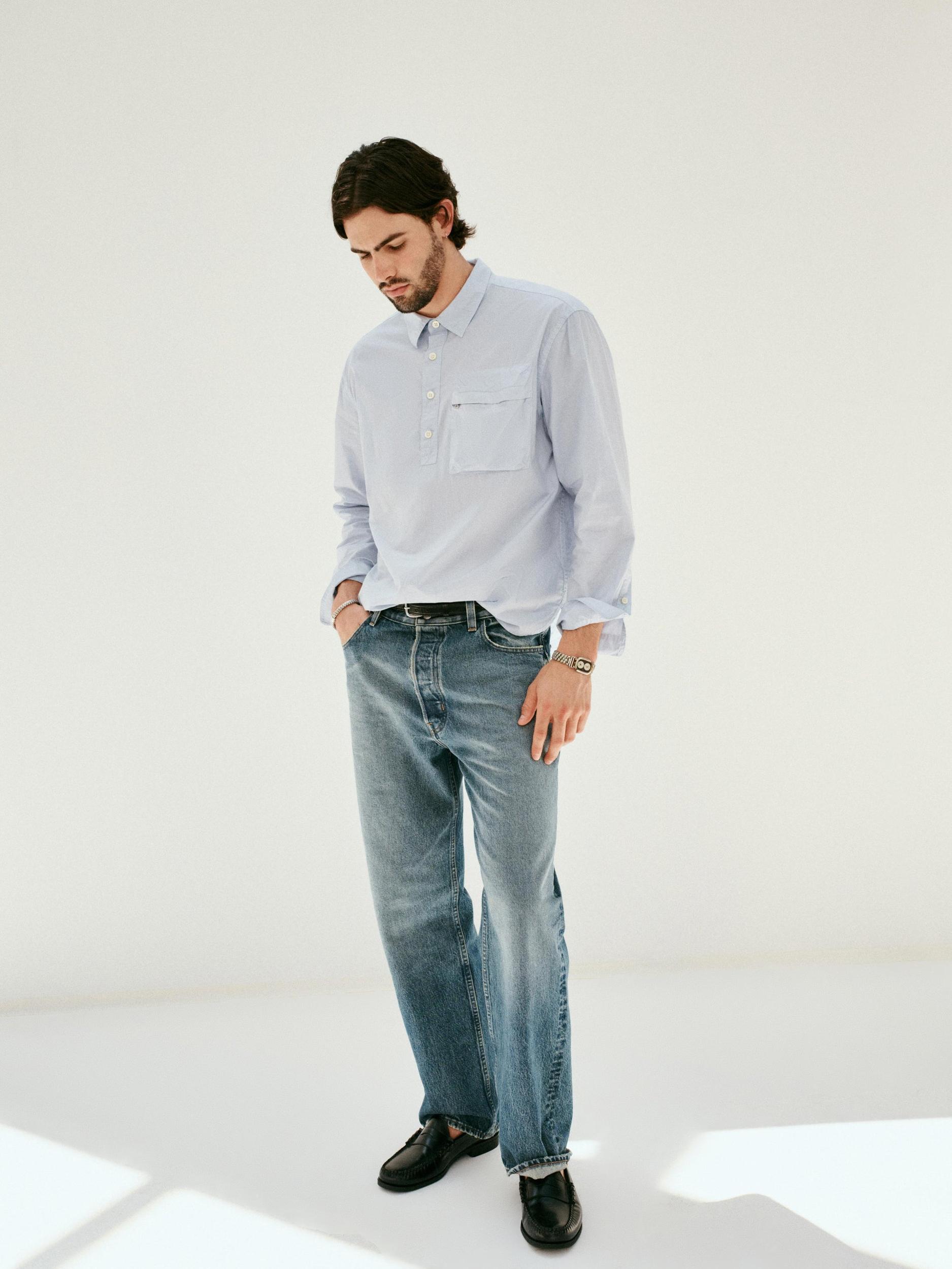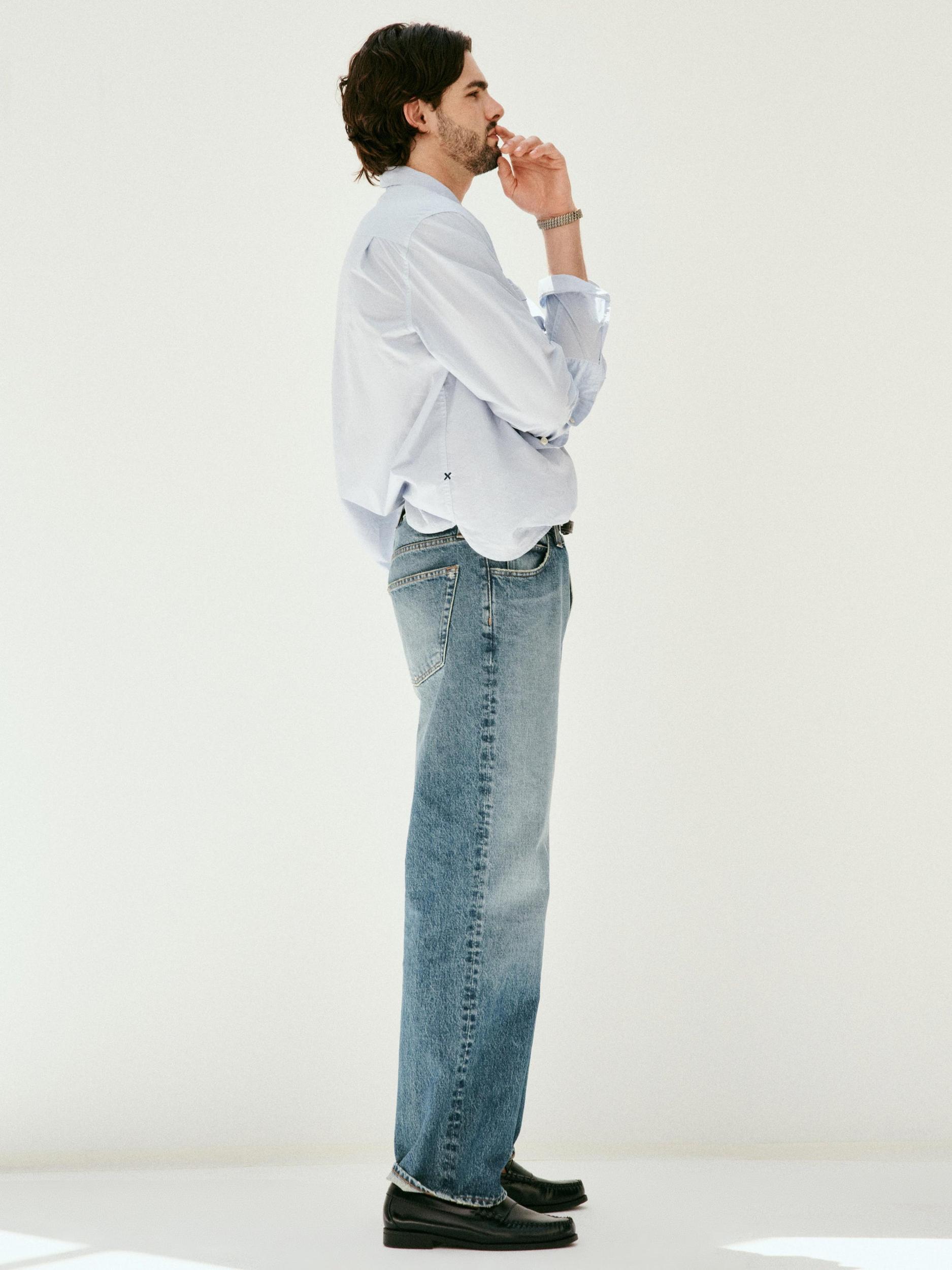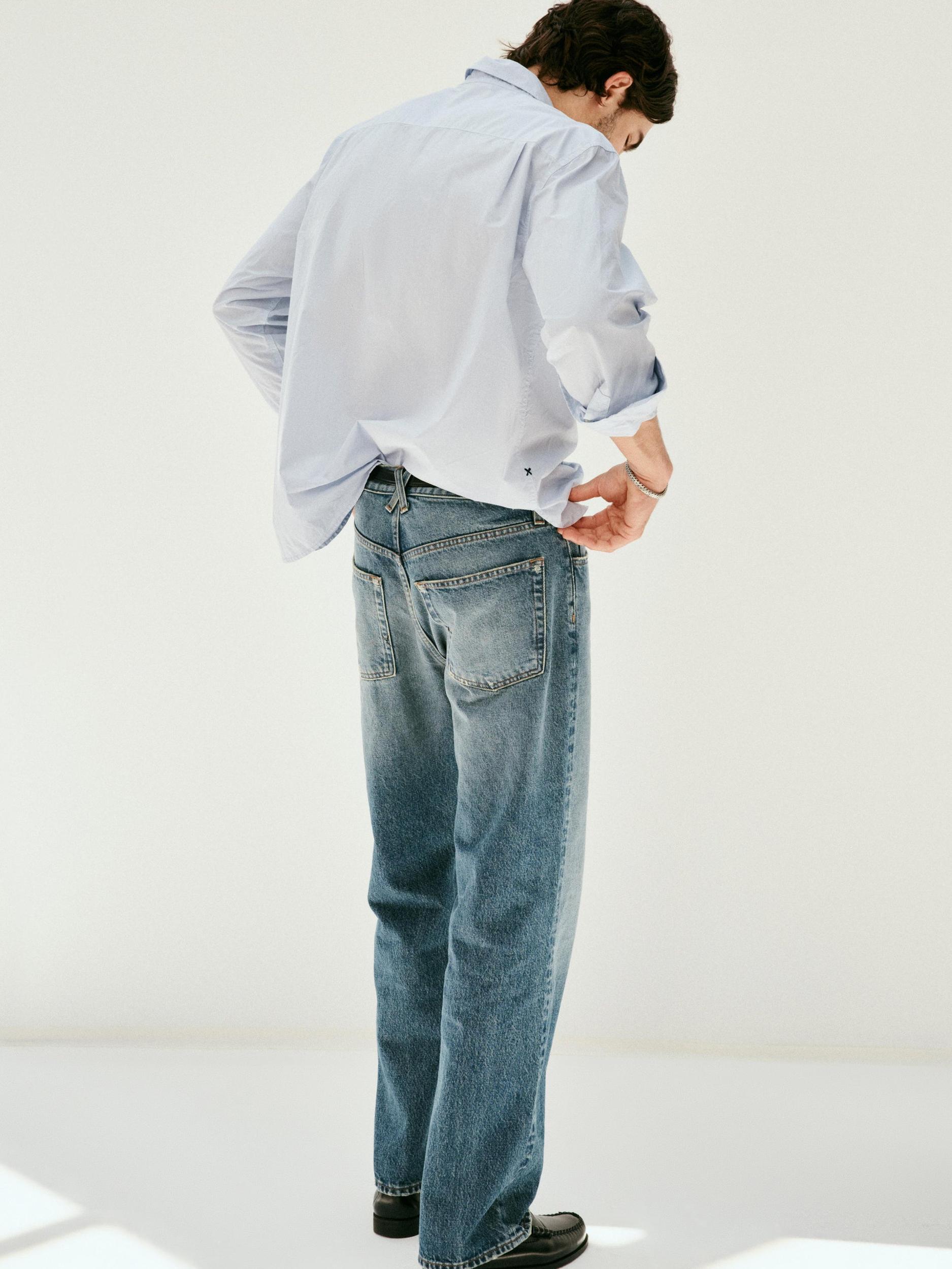 If you like a ‘90s silhouette with a wider leg, these are the ones. 12” rise meant to sit lower on hips. 32" inseam Button fly 15-ounce 100% non-stretch cotton. Fits true to size. If you're in between sizes we recommend sizing up. Gordon is 6’1” and wearing a size 32 Size 32 measures 35" around the waist and 43.5" arou