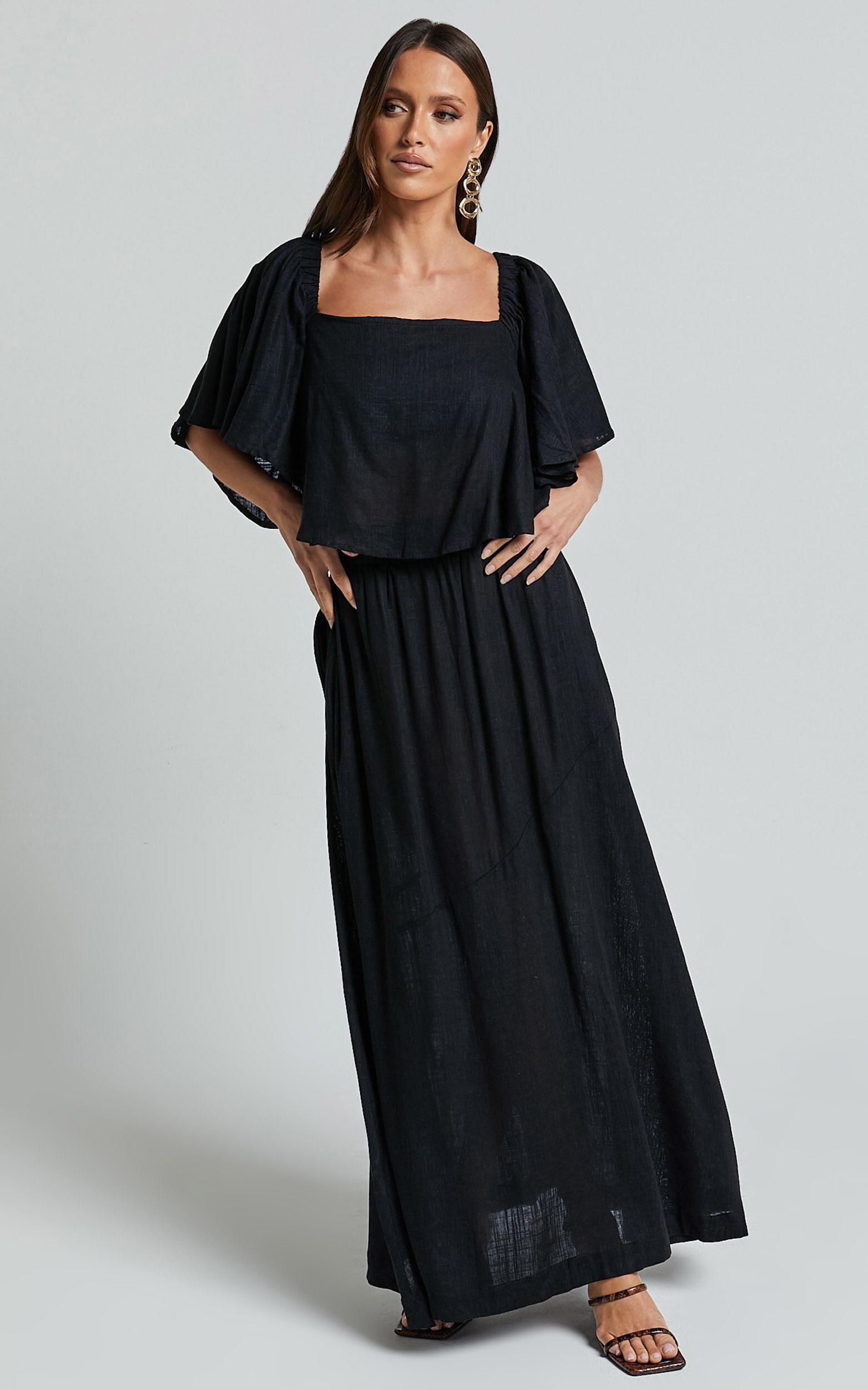 Get ready to turn heads in this stunning Juletta Linen Blend Flutter Sleeve Top and Midi Skirt Two Piece Set by Amalie The Label. Made from a luxurious blend of linen and viscose, this black co-ord set is perfect for those party days where you want to make a stylish statement. The square neckline adds a modern touch, while the flutter sleeves add feminine charm. With its midi skirt and short sleeve top, this two piece set is both trendy and fashion forward. Whether you're headed to brunch or hitting the dance floor, this ensemble will have all eyes on you. So go ahead, step out in style with Amalie's Juletta Linen Blend Flutter Sleeve Top and Midi Skirt Two Piece Set!Product Details:Inner lining for added comfortPull on style for easy wearMade from linen fabricSquare neckline for a trendy lookPerfect for parties and day eventsMidi length for a stylish silhouetteShort sleeves for a breezy feelCrafted from viscose materialSize and FitSize S / 8 top piece length: 43cm / 16.93inSize S / 8 lower piece length: 103cm / 40.55inMaterial and CareMain Fabric: 75% Viscose, 25% LinenLow Stretch