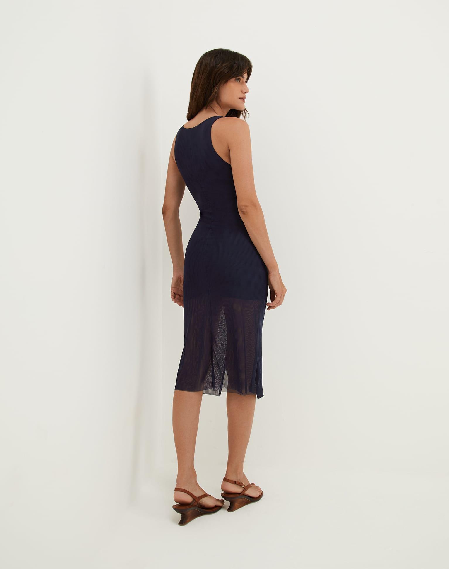 The Amanda Midi Dress is a sleek sleeveless silhouette designed to accentuate your shape. Featuring a V-neckline and a front keyhole detail framed by a silver ring, it adds a touch of shine in just the right place. Ruching along the bodice and a front slit opening offer graceful movement and a flattering finish. Style
