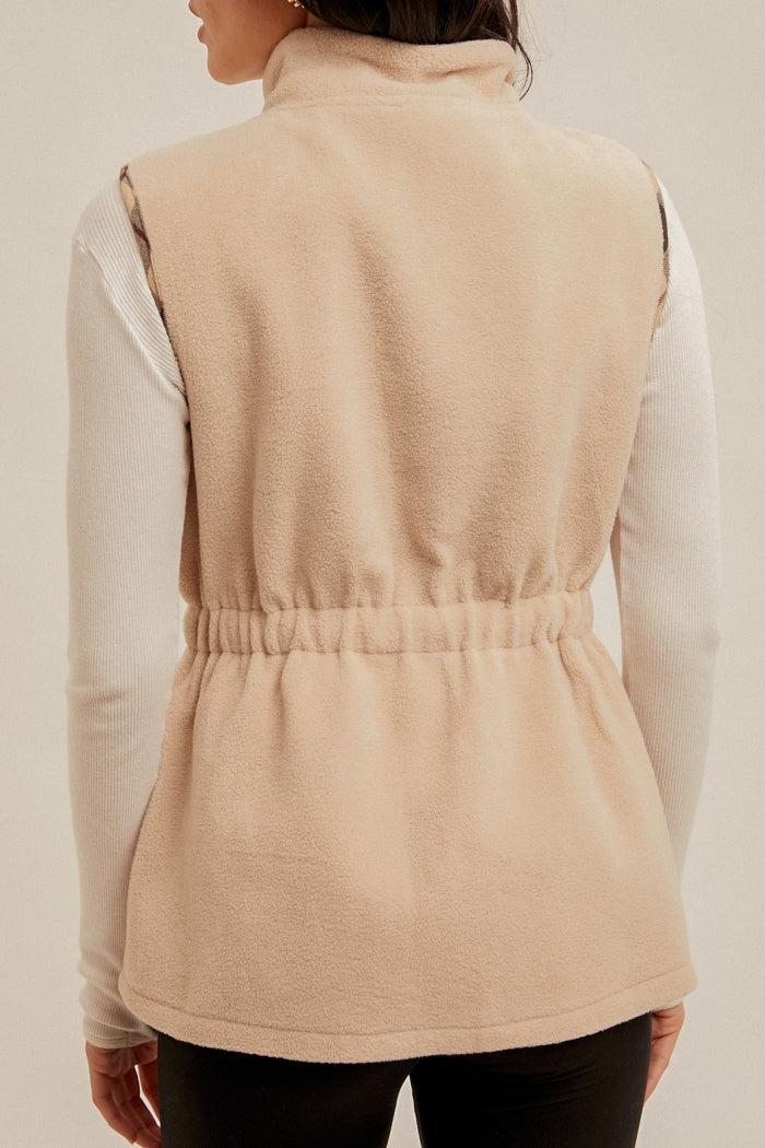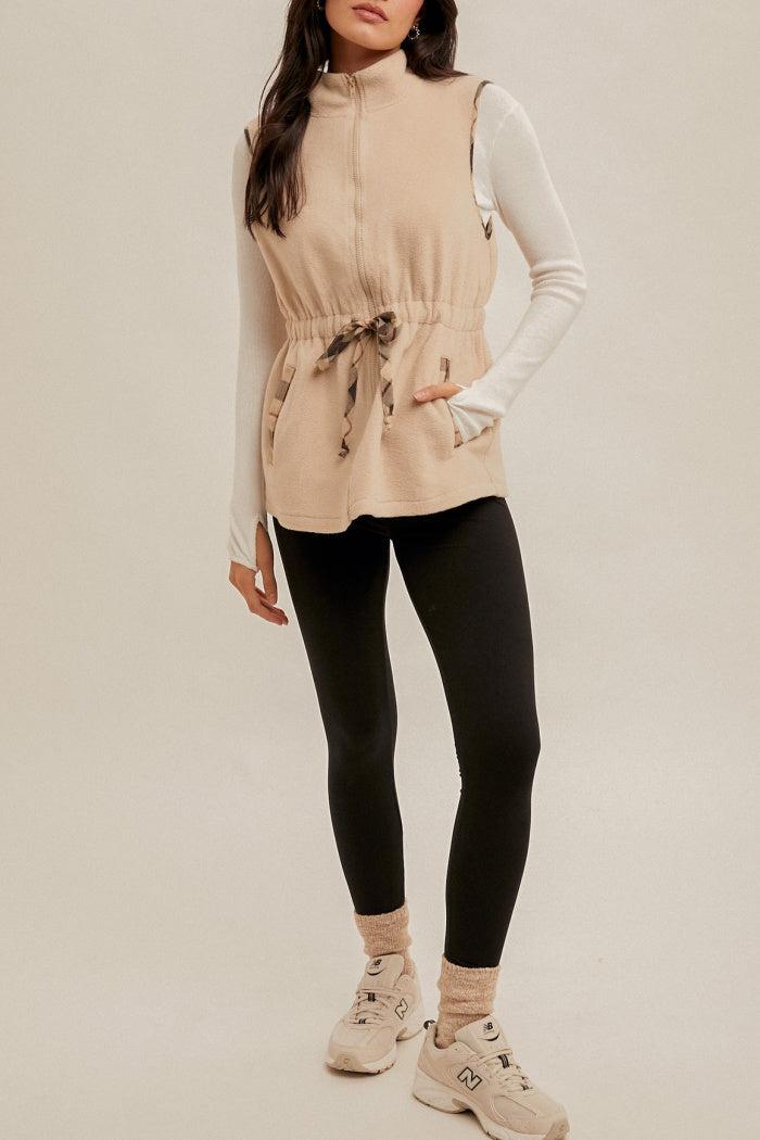 Stylish, solid vest with plaid contrast with zipper front, pockets and elastic waist band with drawstring. Model is wearing a size small. Refer to measurements for your perfect fit.