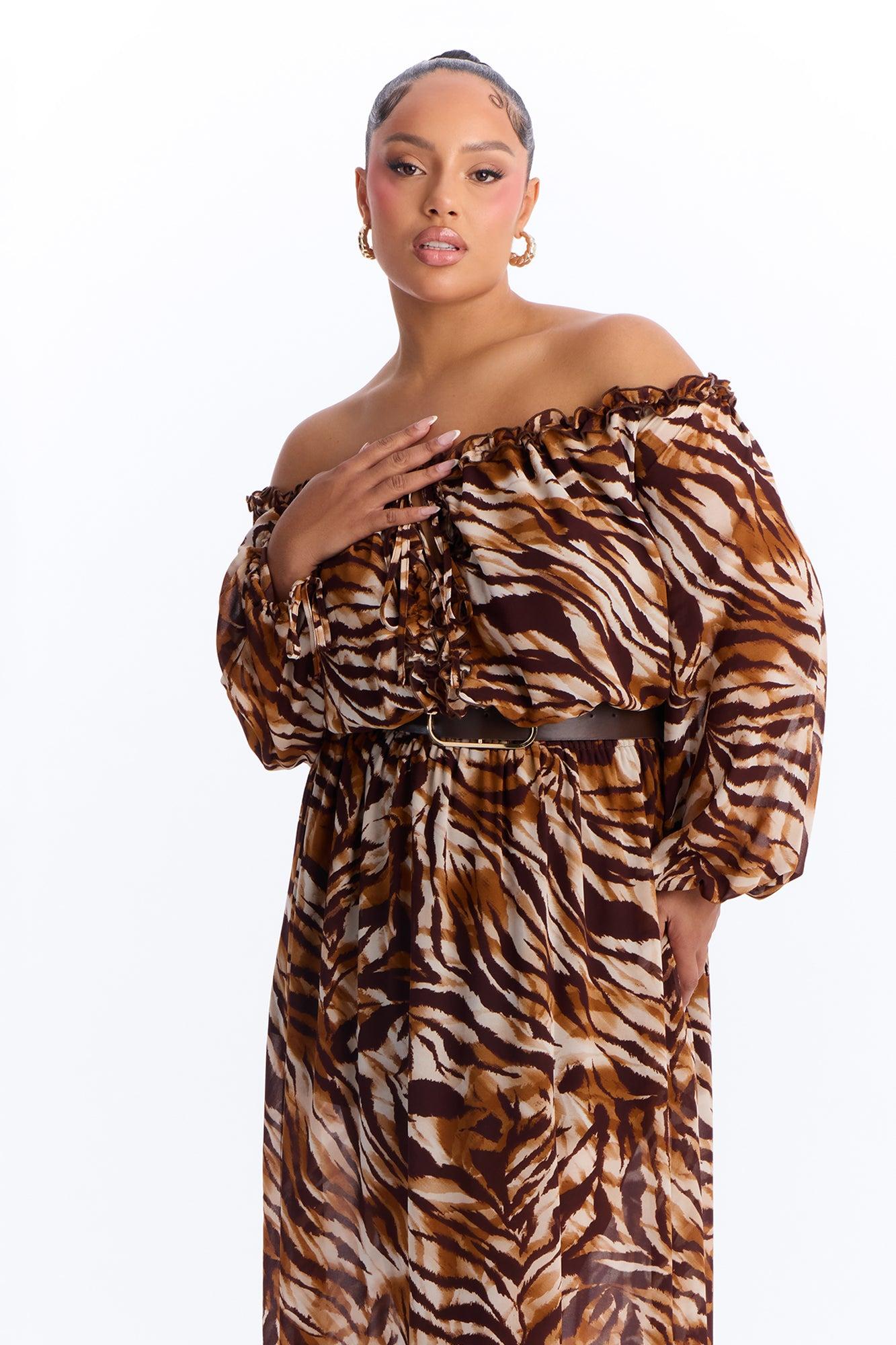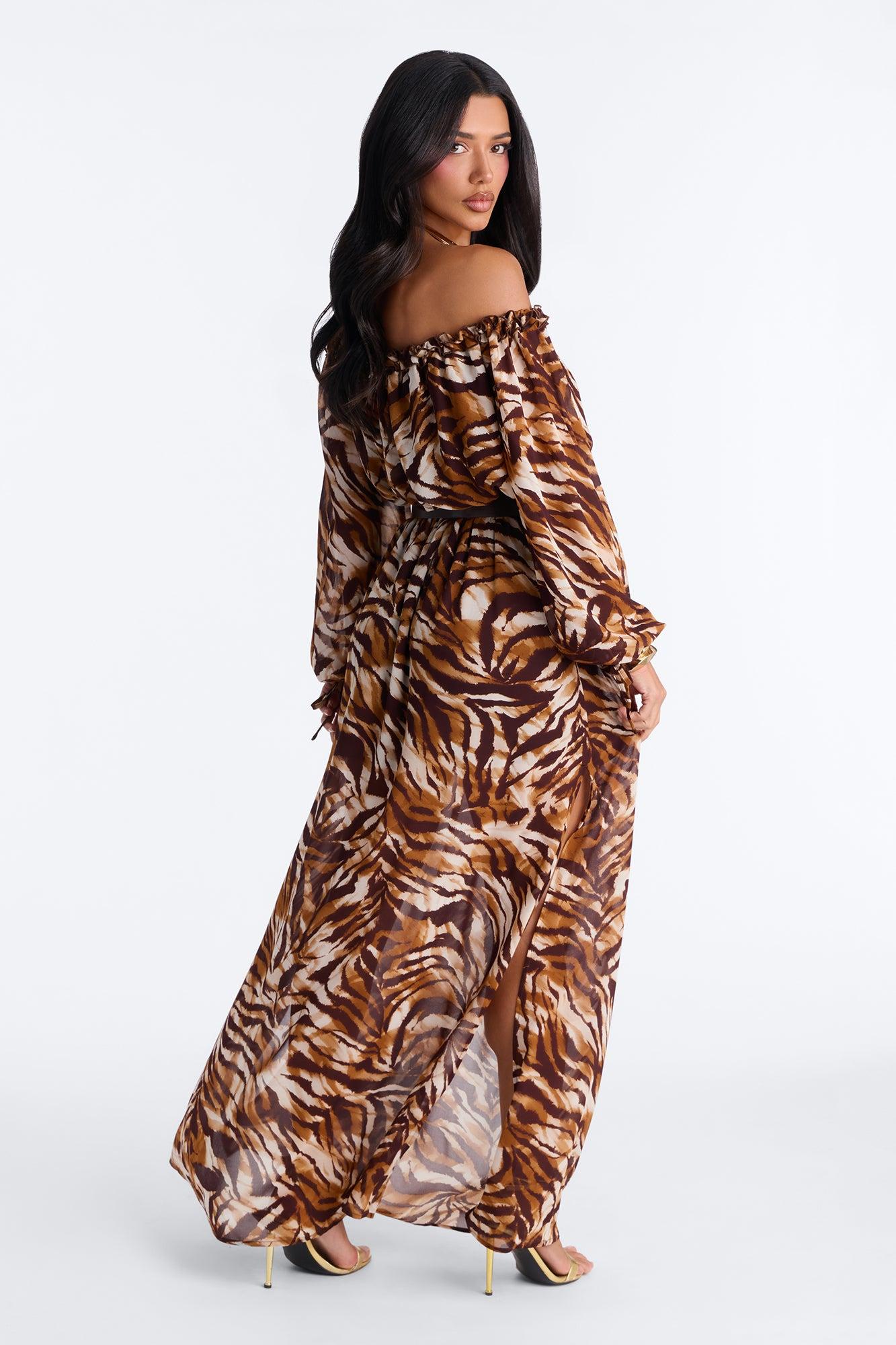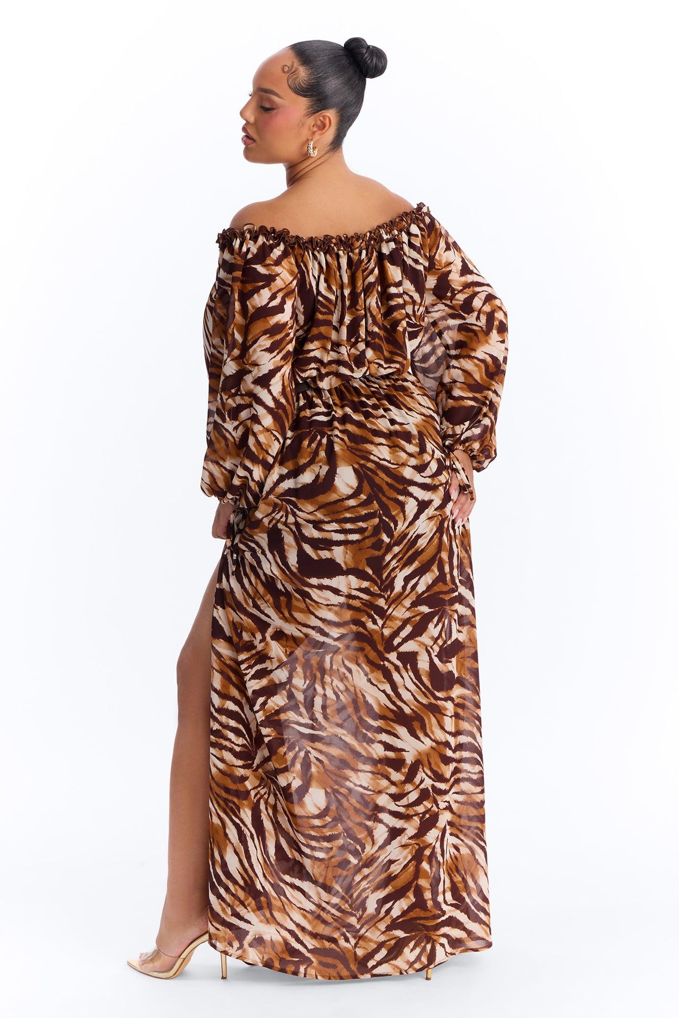 Available In Brown/combo. Chiffon Maxi Dress Long Balloon Sleeve Off Shoulder Neckline Ruffle Trim Tie Front Elastic Waistband Belted Lined Stretch Disclaimer: Print Placement Will Vary. Self: 100% Polyester Lining: 100% Polyester Imported Available In Plus Sizes California Proposition 65WARNING: Cancer and Reproductive Harm - www.P65Warnings.ca.gov.