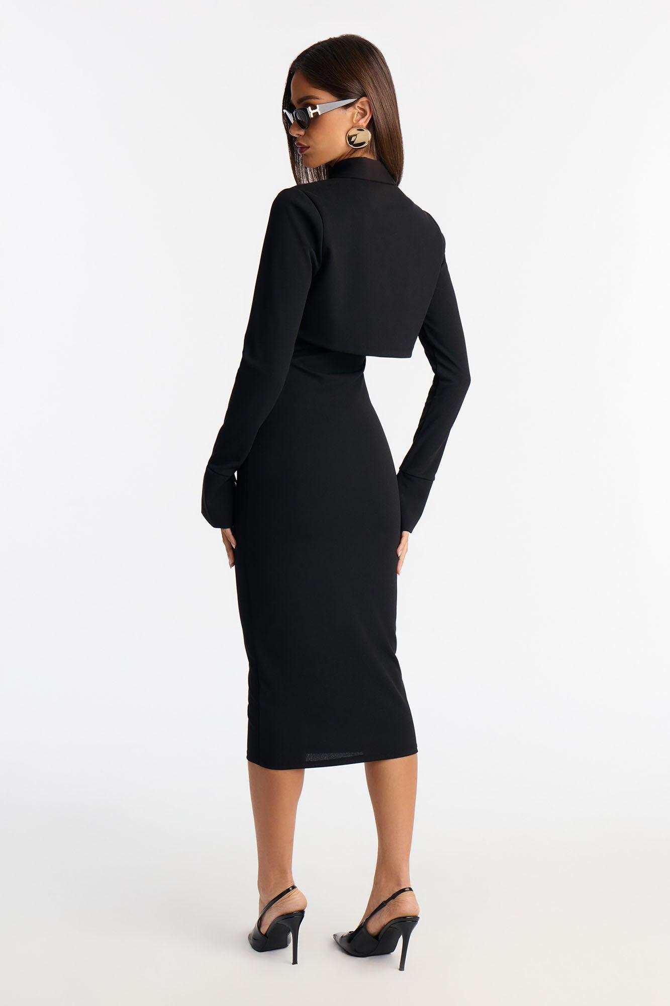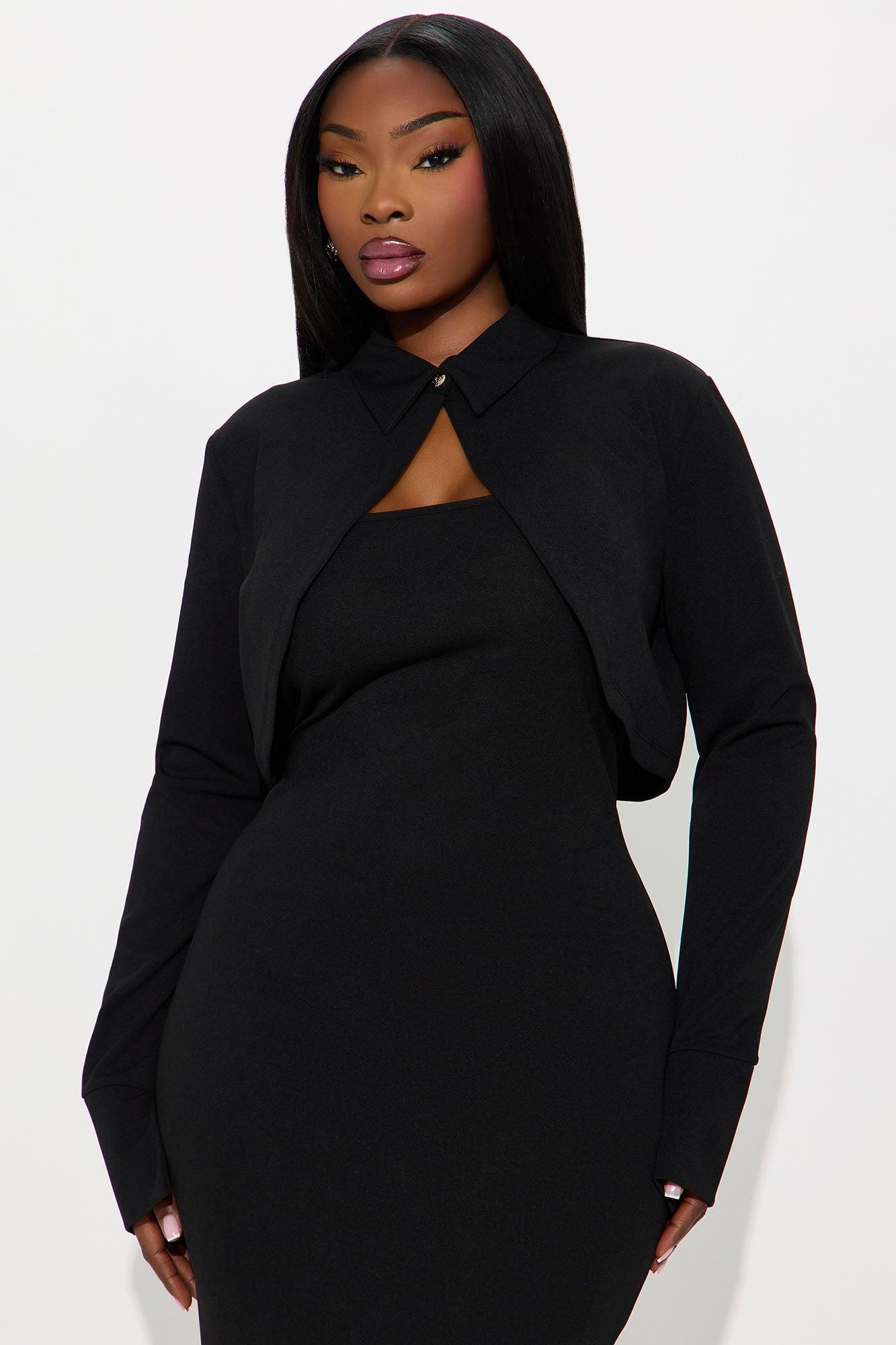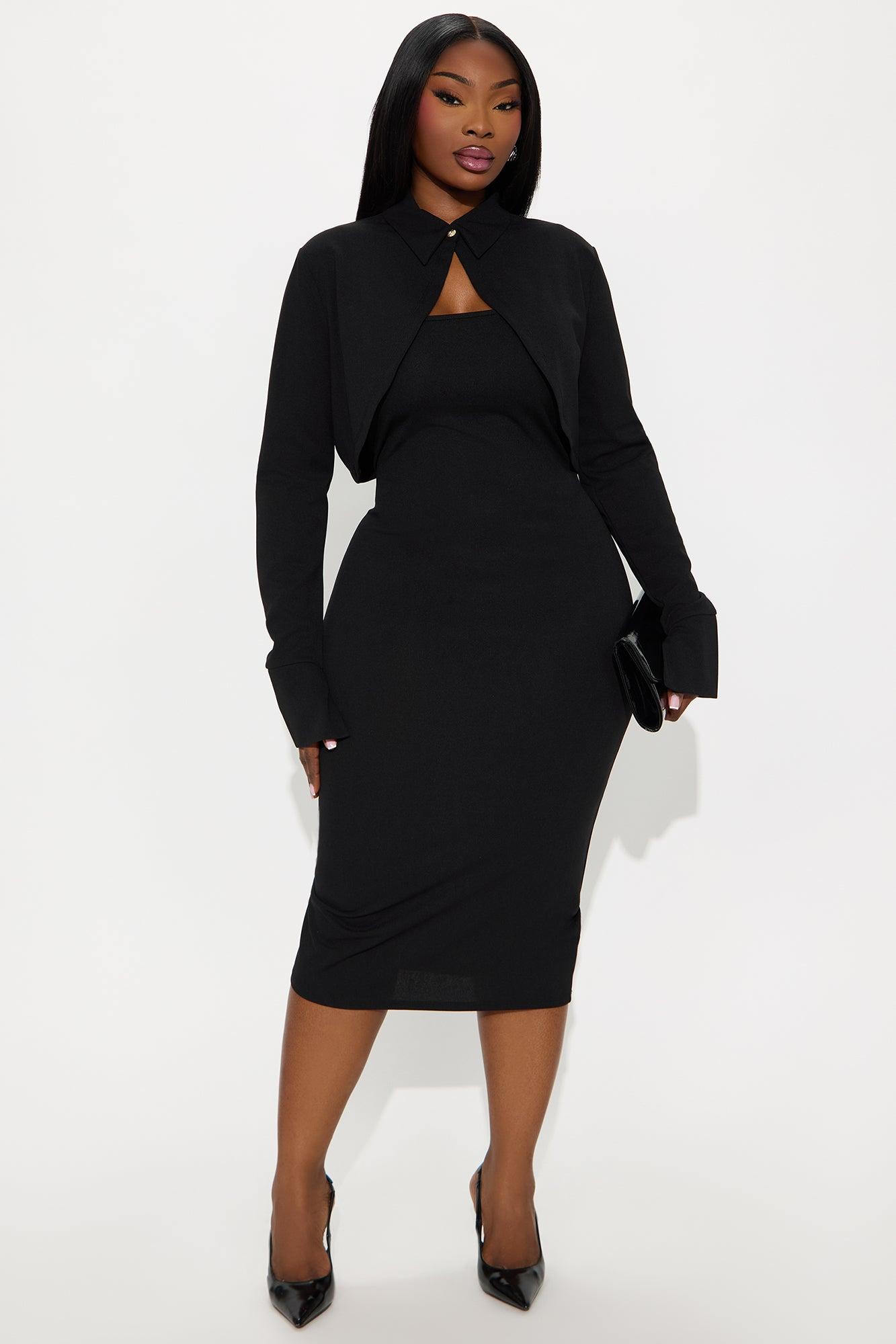 Available In Black And Pink. Crepe Knit Midi Dress Set Square Neck Sleeveless Button Front Jacket Bell Sleeve Jacket Stretch Length Measured Flat = 45" Self: 95% Polyester 5% Spandex Imported California Proposition 65WARNING: Cancer and Reproductive Harm - www.P65Warnings.ca.gov.