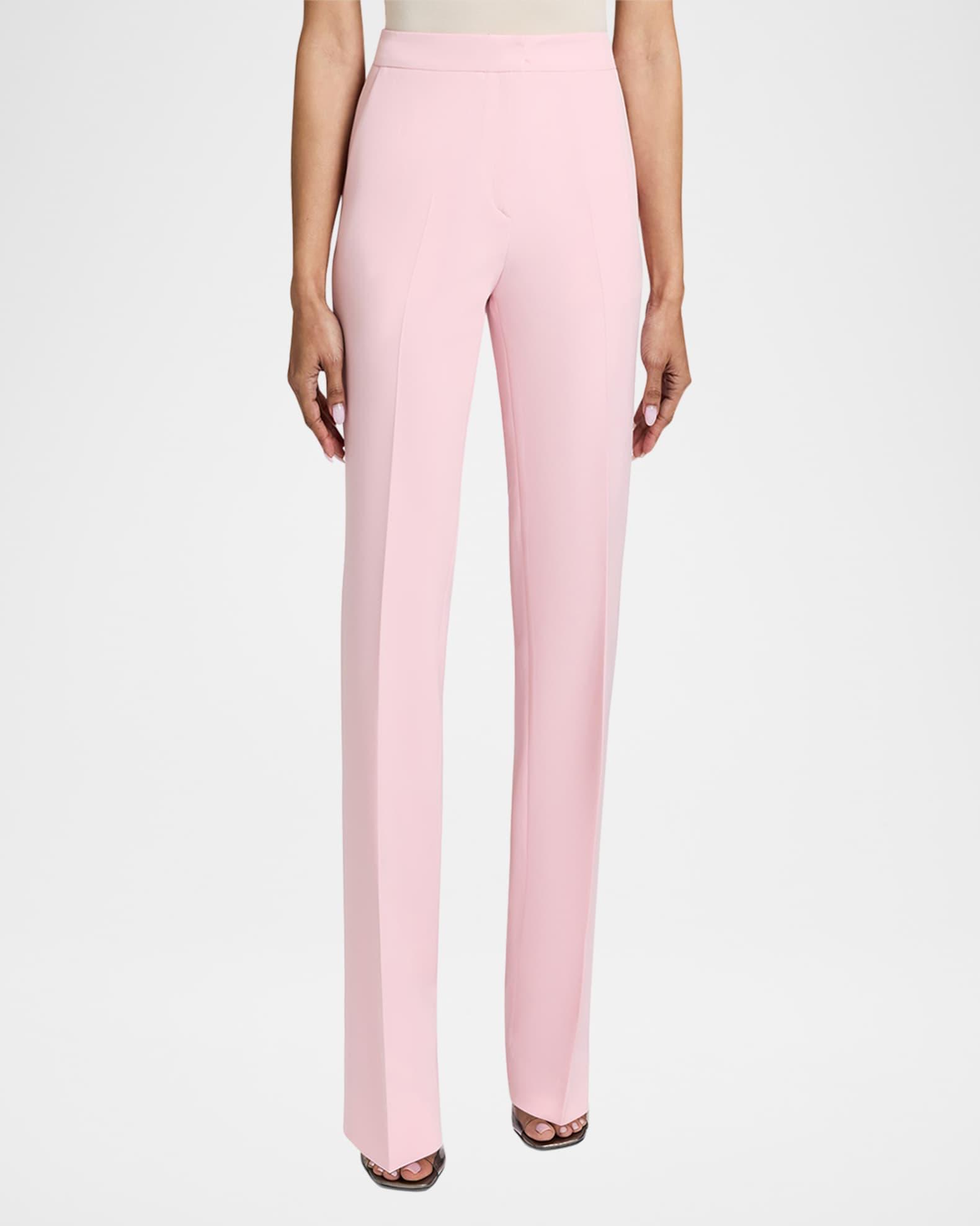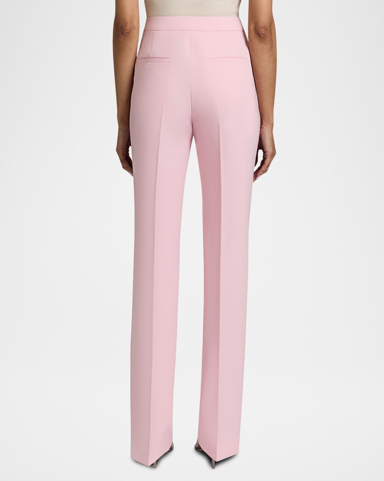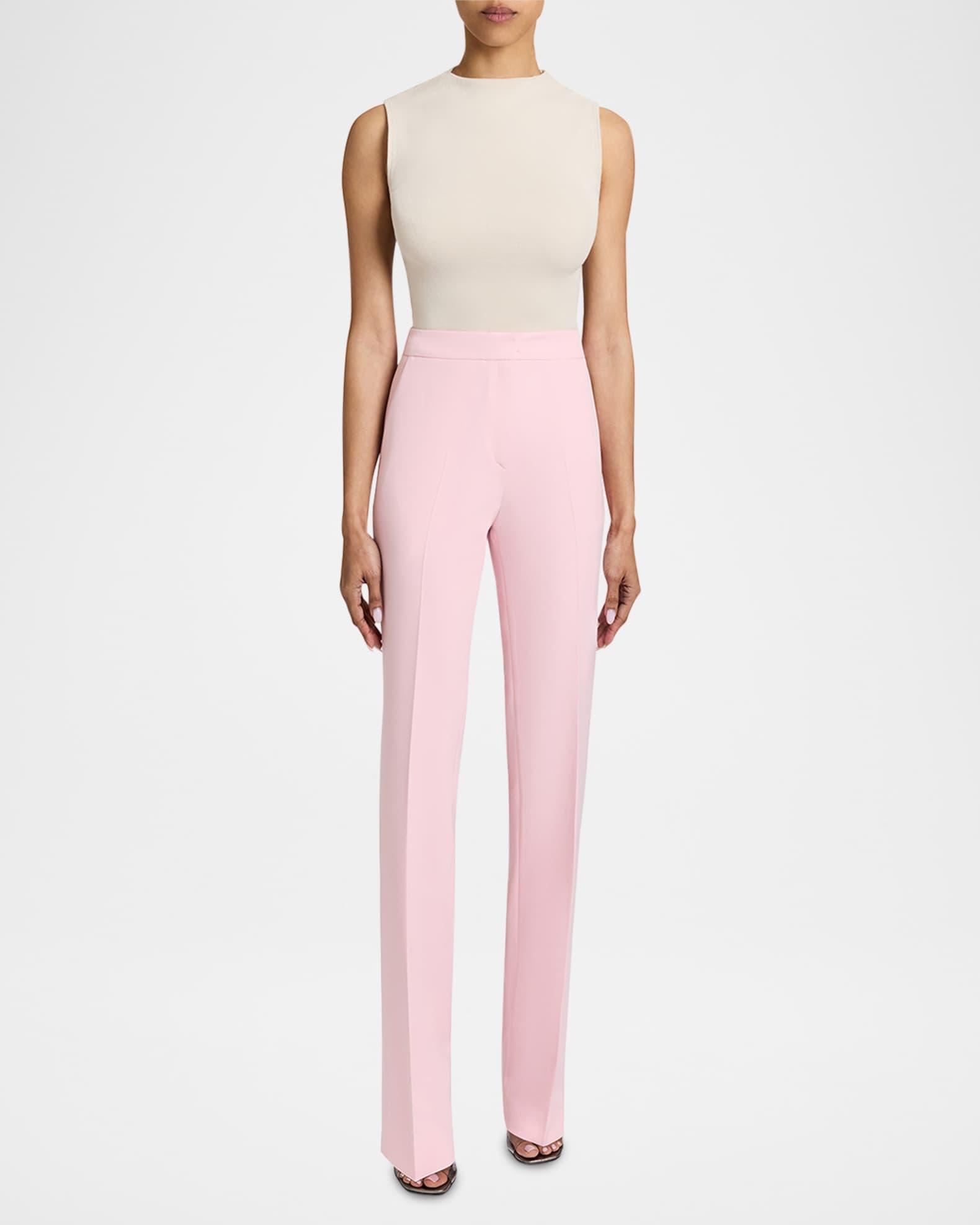 Santorelli "Amara" soft crepe pants with leg-lengthening pressed pleats Approx. measurements 10.5" rise; 34" inseam High-rise sits high on the hips Flat front Side slant pockets Back welt pockets Full length Straight legs Button/zip fly Polyester/spandex Unlined Dry clean Made in Italy