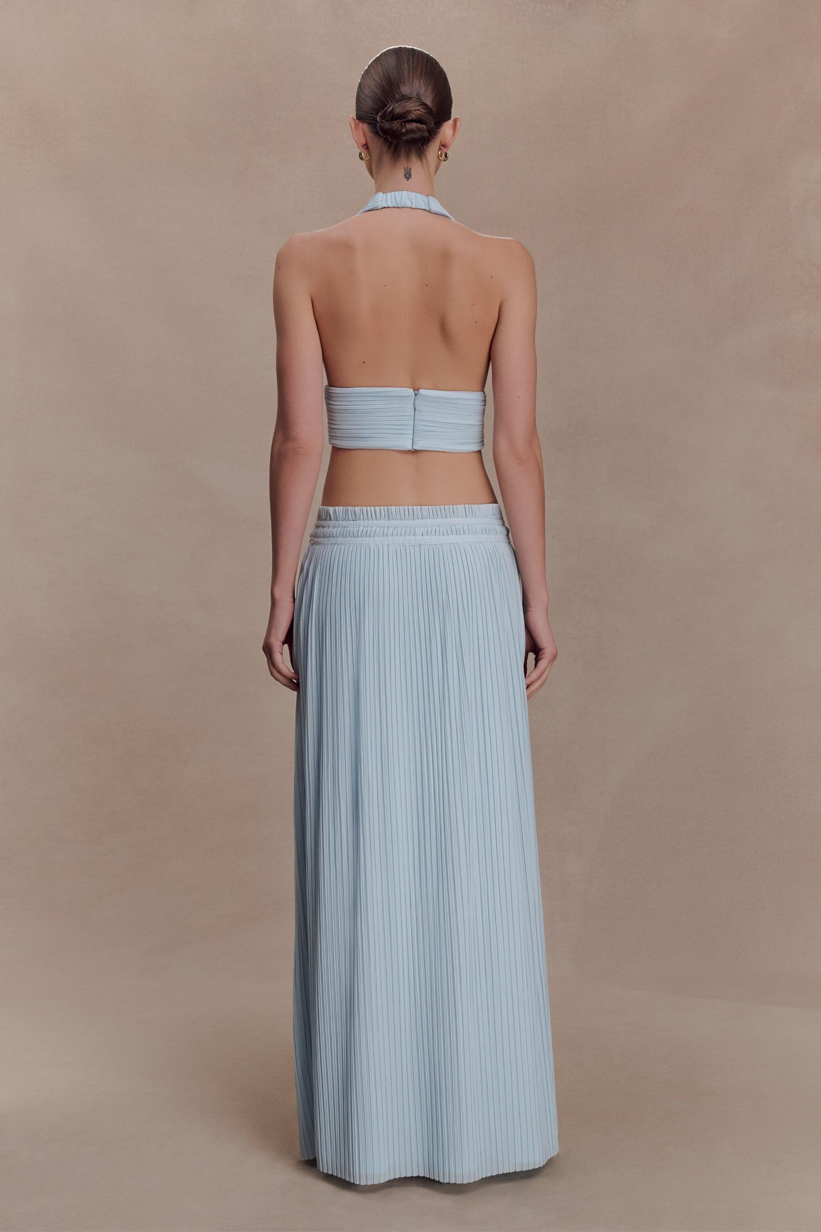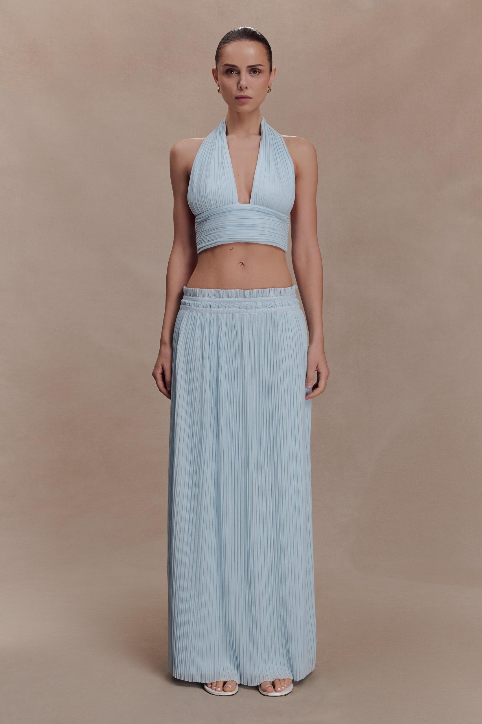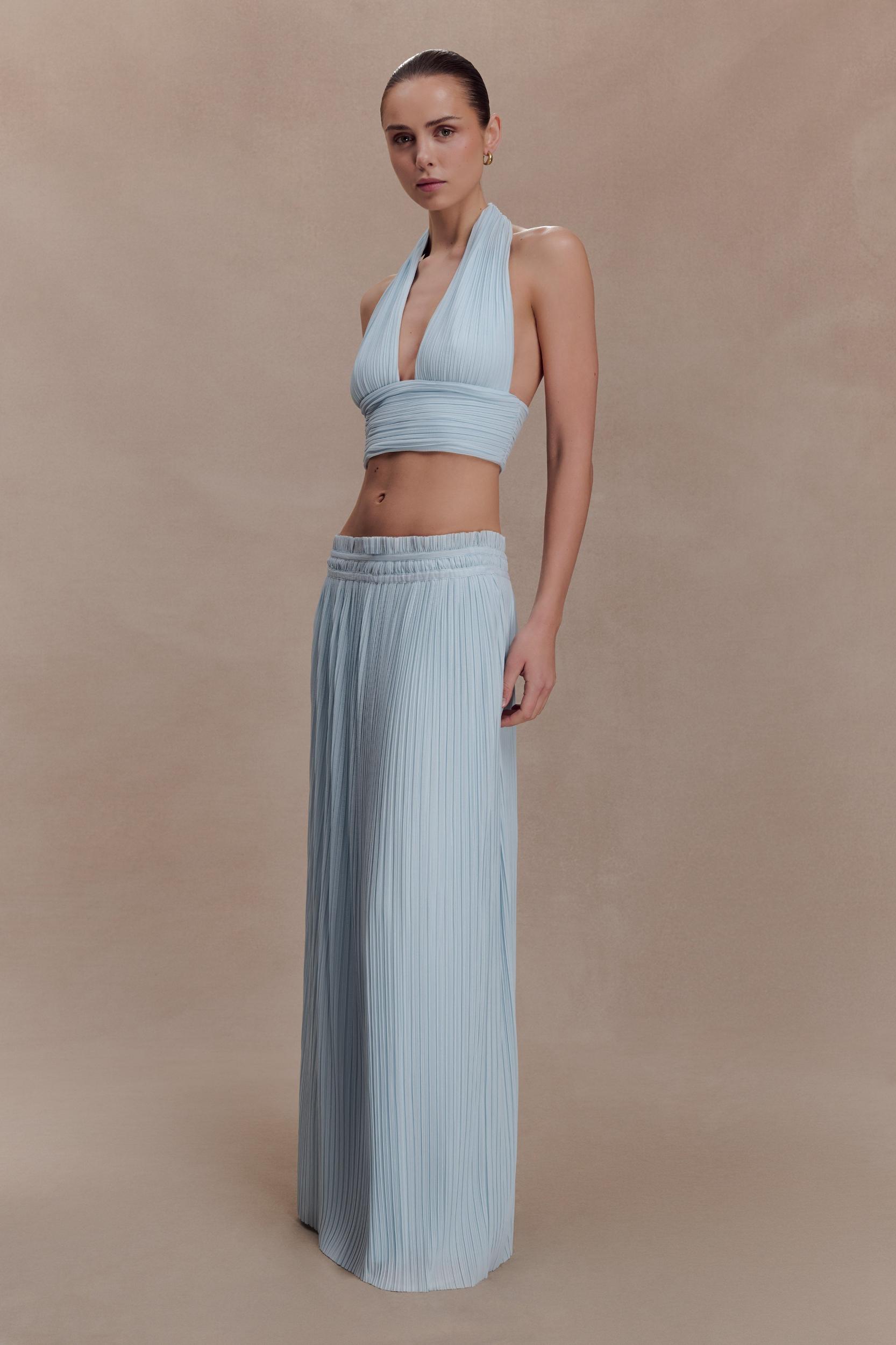 Fluid femininity. The AMARIS Sleeveless Plisse Halter Top brings soft movement to a sleek, body-contouring silhouette. Designed with a plunging V neckline and an elasticated halter neckband, it frames the décolletage with effortless elegance while offering a secure, comfortable fit. Fine plissé pleating adds texture and dimension through the fitted bodycon shape, enhanced by full lining for a smooth, refined finish. Completed with an invisible zip for clean closure, this top is a modern statement in fluid sophistication — perfectly styled alone or paired with the matching skirt.